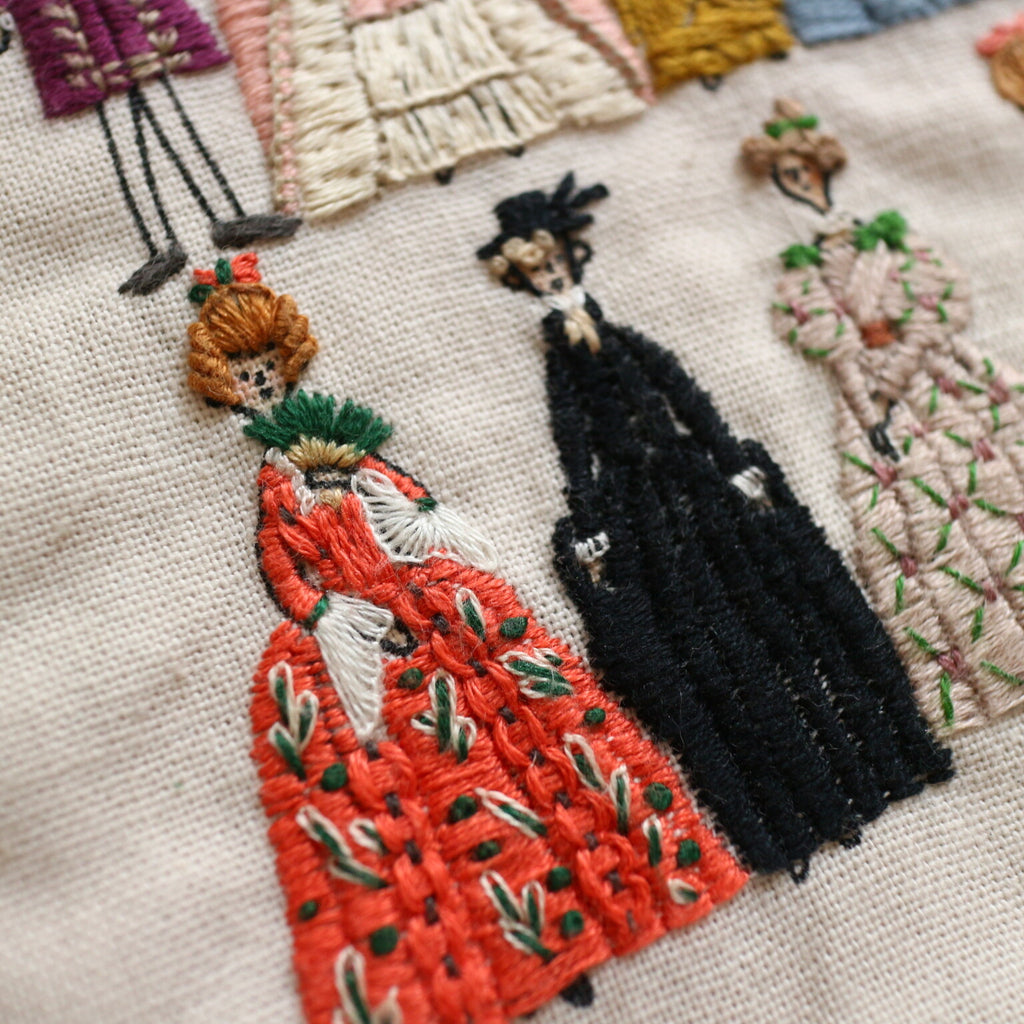 The kit provides embroidery stitch and thread details for four women and one man, giving you a jumping-off point to design the rest - using the photos shown or however you wish! Think pastel gowns with delicate lace, opulent metallic trims, and regal cravats. Whether you keep it historically accurate or go wild with colors and textures, this tote will be uniquely yours.
