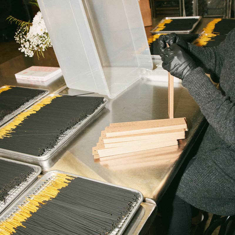 Incense quickly transforms a room - the uplifting smoke fills the space while our signature scents linger for hours even after extinguishing. Our charcoal-based incense is hand-dipped in-house using fine fragrance oils and dipropylene glycol (DPG), a synthetic base commonly found in body care and home fragrance products.