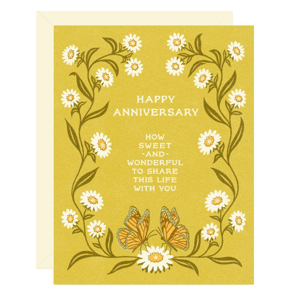 Celebrate love with this romantic anniversary greeting card featuring blooming daisies and two delicate butterflies.