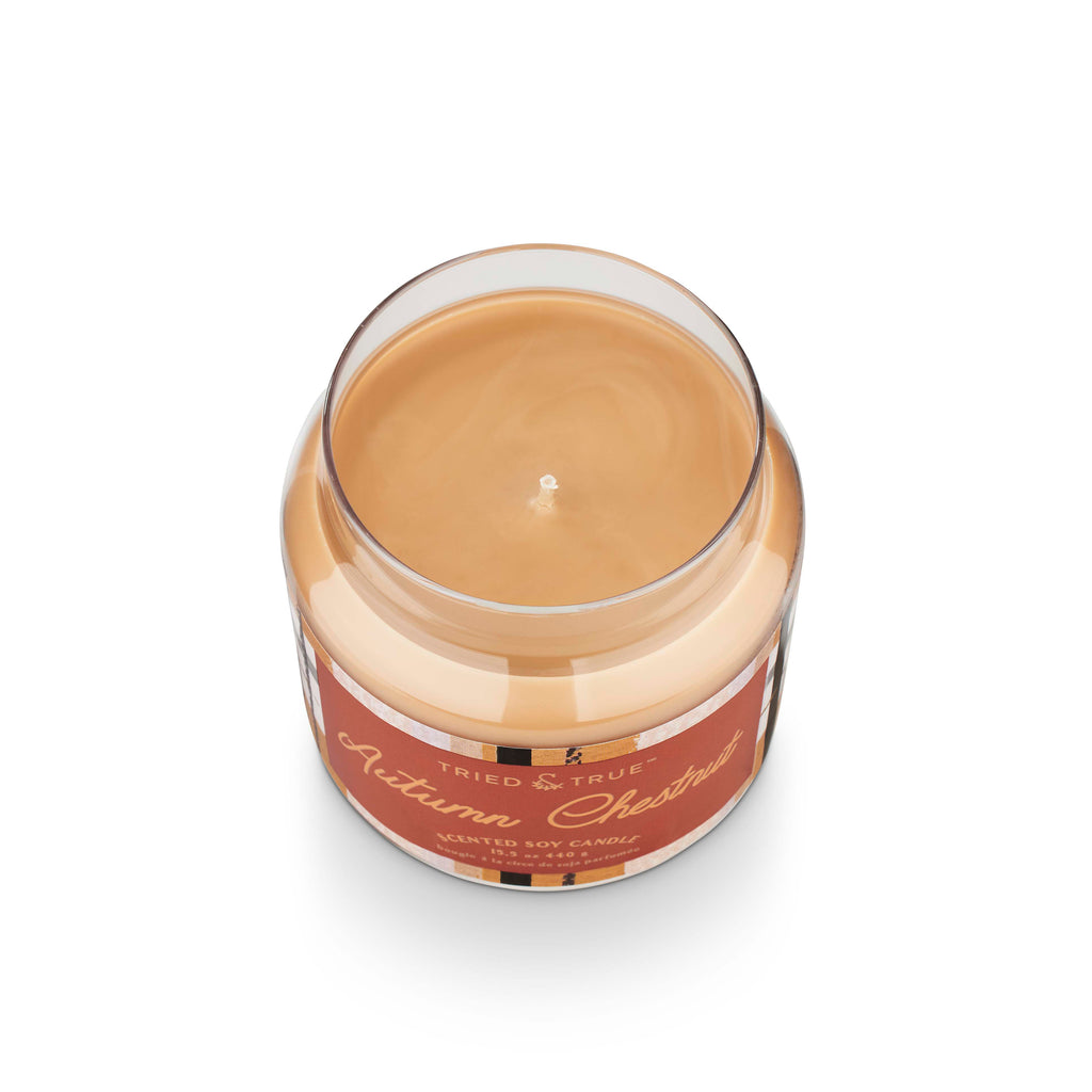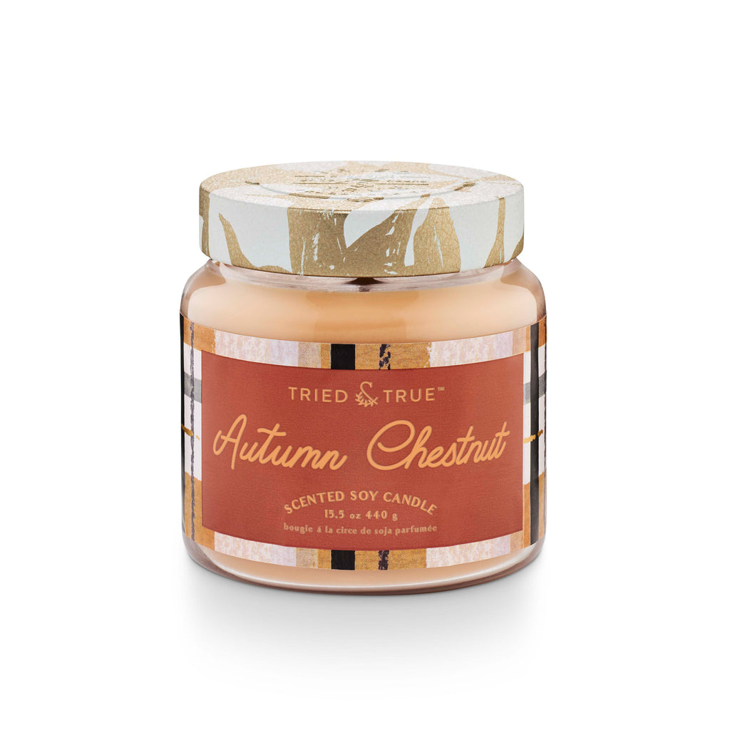 This cozy candle captures the warmth of celebrating the turn of the year with grounded notes of glazed peach, creamy butter, and roasted chestnuts. The large jar features colored wax and a decorative wrap label with beautiful details like metallic foil and hand illustration, plus an embossed lid.