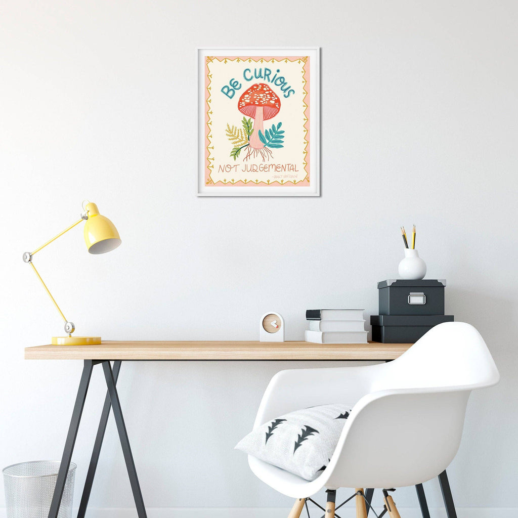 "Be Curious, Not Judgemental" is an archival print made on beautiful matte fine art paper with vibrant inks. This cute illustration features a mushroom, ferns, and a pearl of wisdom. All art prints are printed by Dream Folk in a home studio in South Dakota.