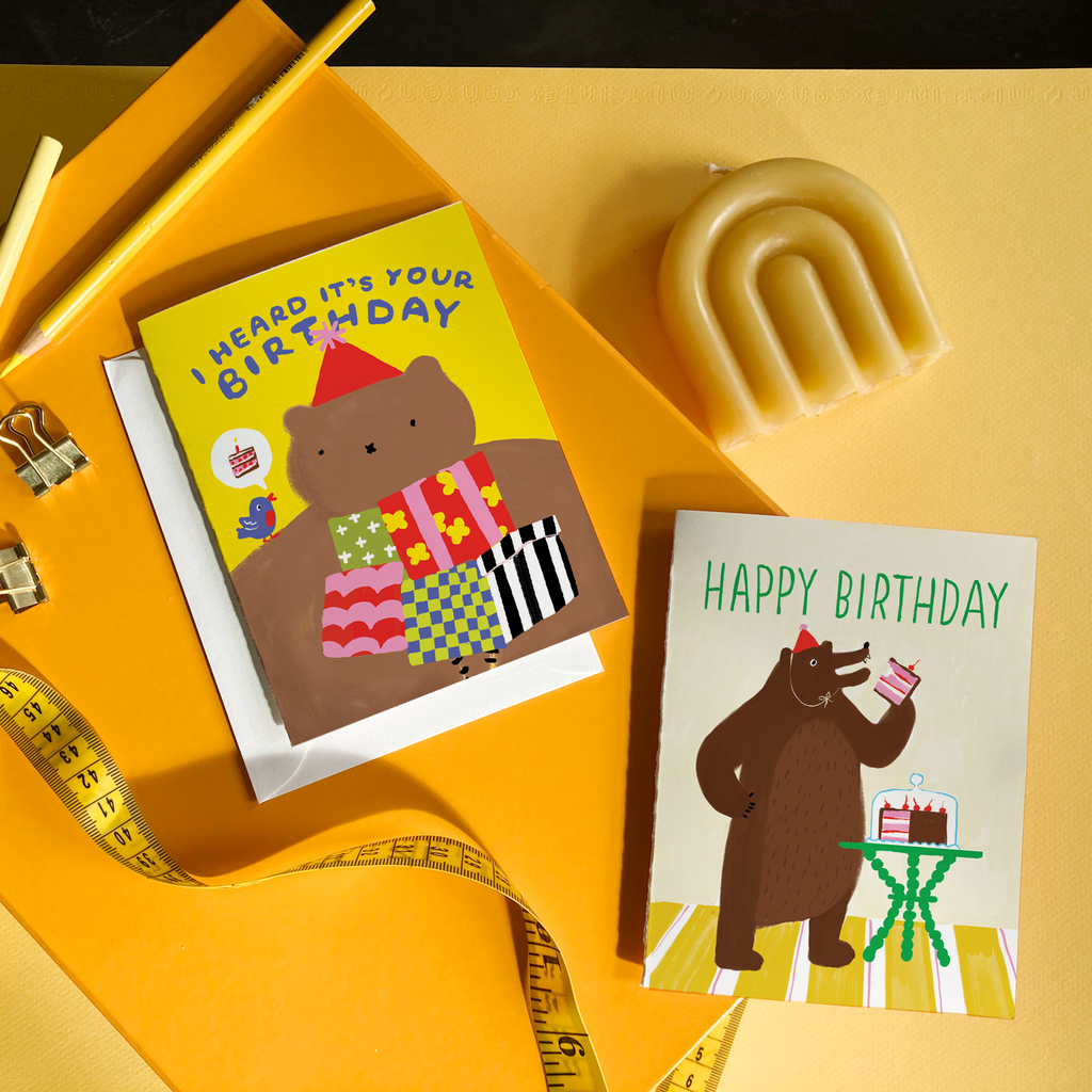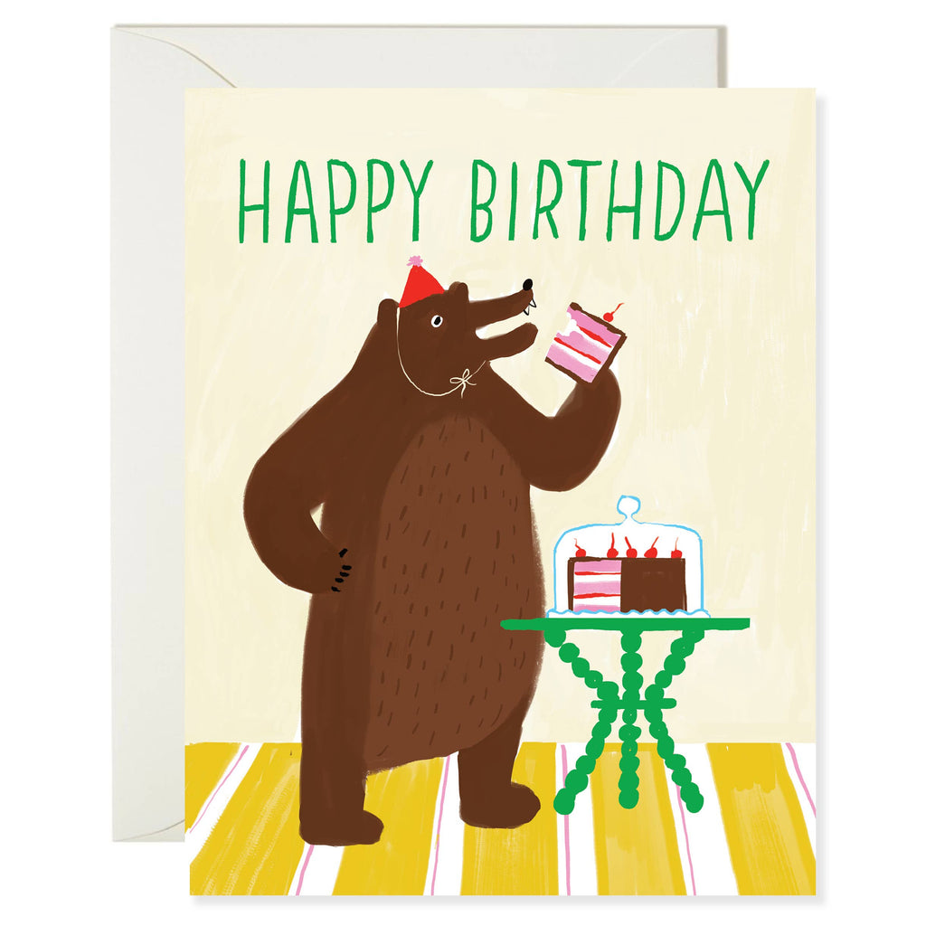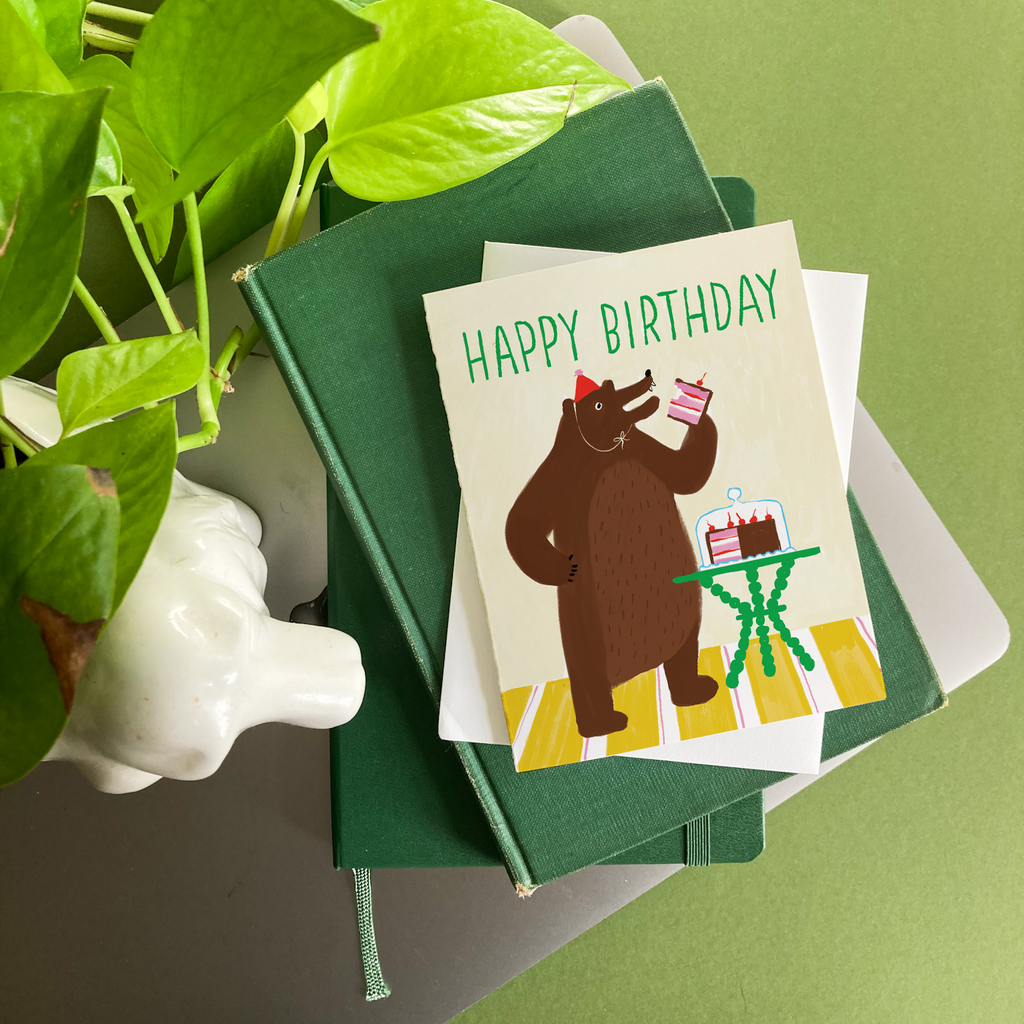 For a birthday card that feels both funny and wildly relatable, the Bear Eating Cake Birthday card takes the cake—literally. This quirky design shows a bear seated at a table, one paw grasping a towering slice of cake while an untouched birthday cake waits beside it. The caption “HAPPY BIRTHDAY” tops off the scene, adding a straightforward touch to the bear’s indulgent moment. This card speaks to food lovers, introverts, and anyone who believes birthdays should be about good cake and quiet joy.