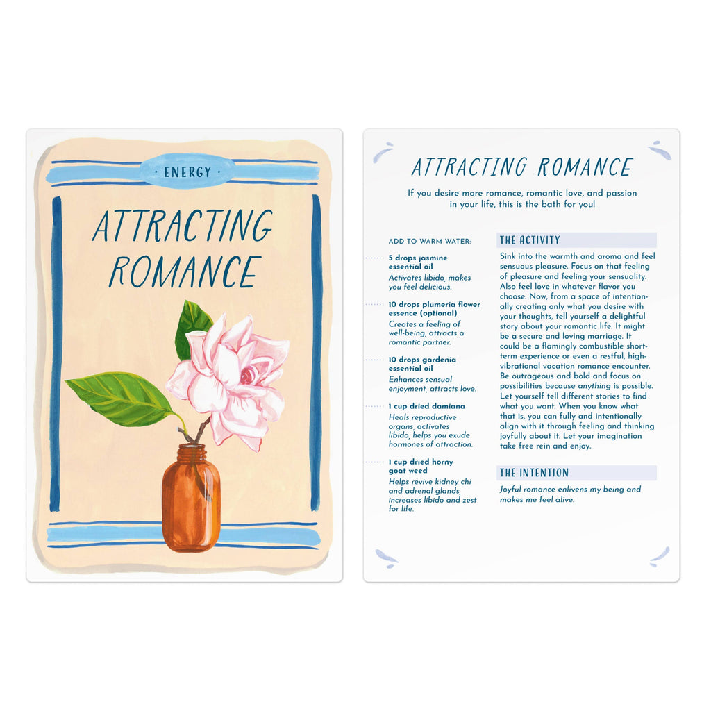 Each card has a "recipe" with ingredients on one side and an intention or mantra on the other. Whether inviting happiness with lemon peel and daisies for the Inner Smile bath or preparing for a Focus on Your Senses bath with rosemary and sea salt, there's something for everyone in this charming, colorful deck.