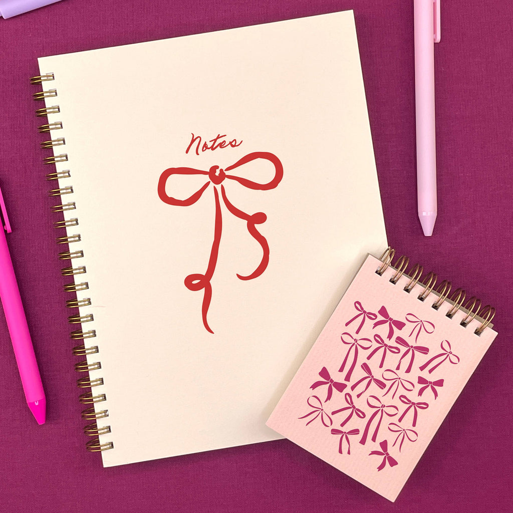 A playful twist on a classic! Our Bow Pattern mini jotter features a light pink (Sunset Pink) cover with mulberry letterpress ink bows in all shapes and sizes. Cute, whimsical, and perfect for notes, lists, or sweet doodles.