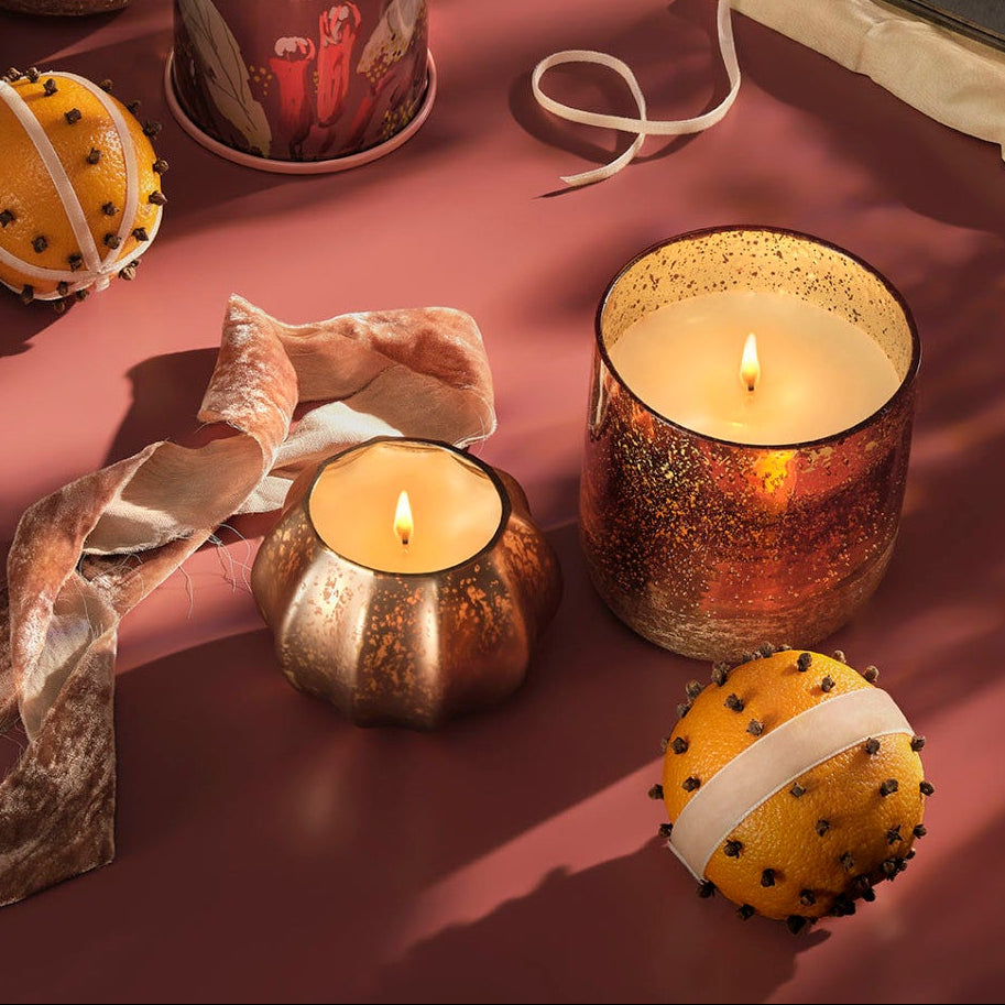 This candle has a sophisticated scent grounded in smooth sandalwood with cardamom pomander and bright tangelo. The beautiful mercury glass container adds elegant style to any space.