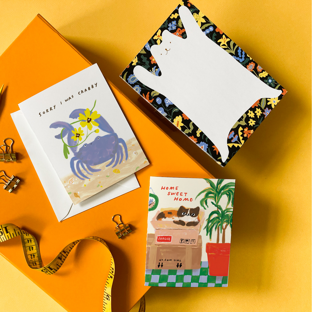 This too-cute housewarming card features an adorable cat lounging in a cardboard box, surrounded by greenery and charming home décor. It's warm, a little funny, and entirely relatable for anyone who's just settled into a new place (and maybe hasn’t unpacked yet).
