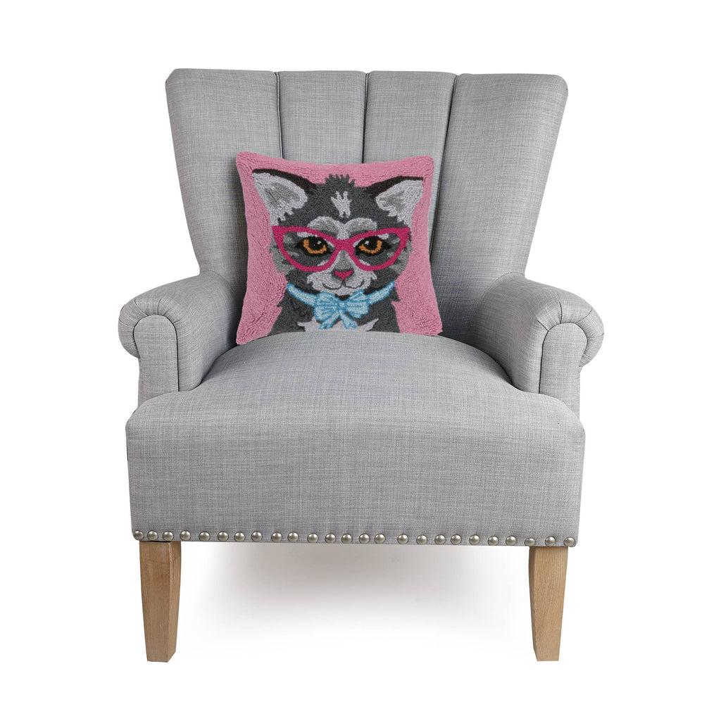 Add a touch of whimsy to your decor with this charming pillow featuring a stylish cat wearing pink glasses and a bow tie. The 100% wool face adds texture and detail, while the soft back ensures comfort. With a zipper closure and removable polyester insert, it’s easy to care for and perfect for cat lovers looking to liven up any space!
