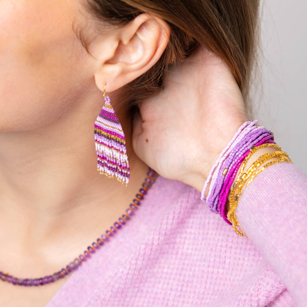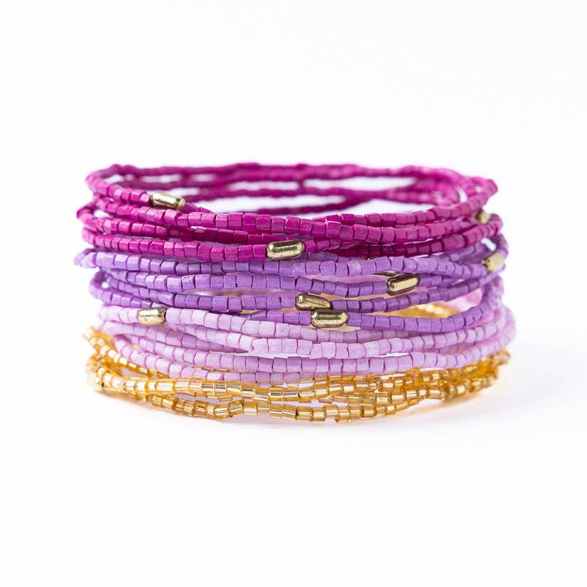 Create a mesmerizing ombre right on your wrist with the Chelsea Luxe Beaded Bracelet Stack! The bracelets are stretchy and boast delicate glass beads in magenta, purple, pink, and gold; they make for great statement accessories, without the bulk. Mix and match: wear a couple at a time, share them among friends, or wear the whole stack of eighteen!