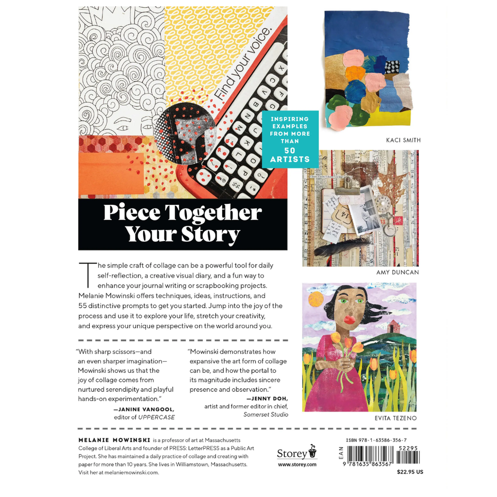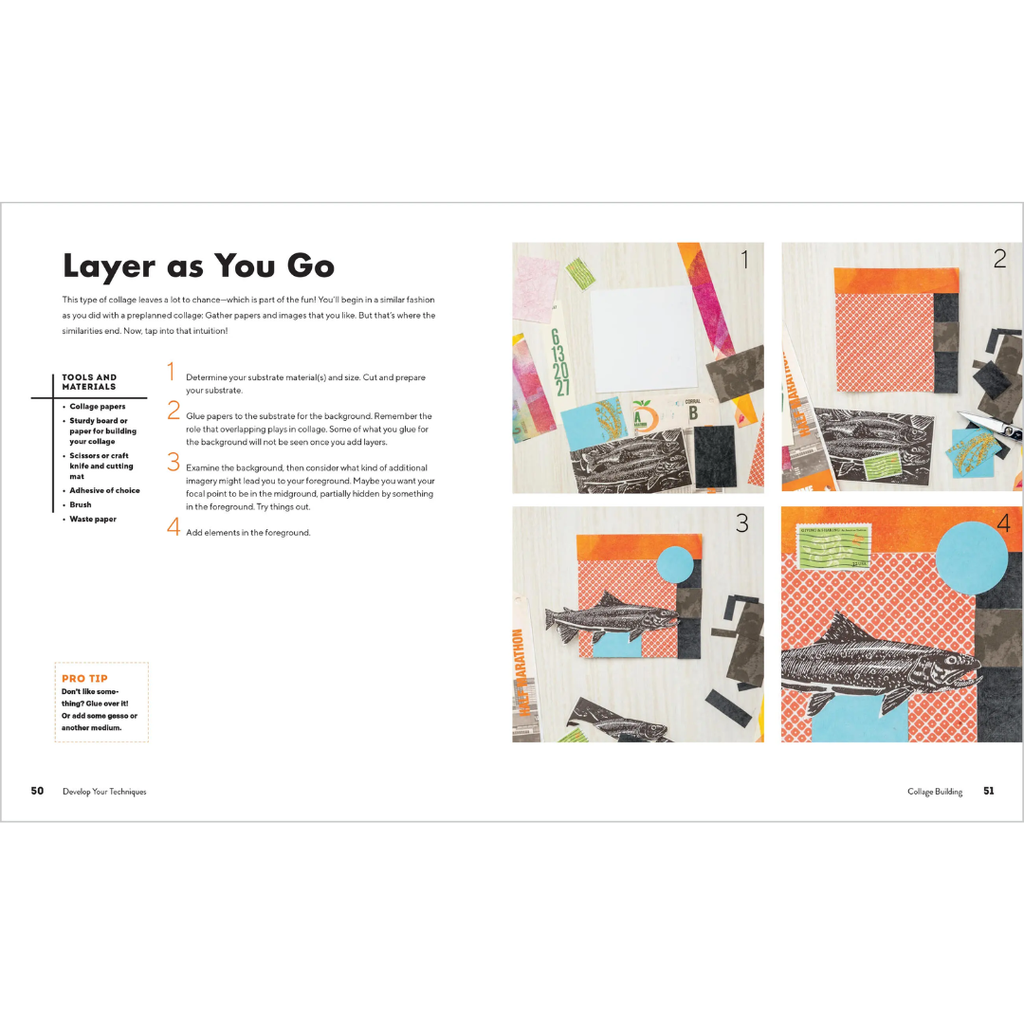 In Collage Your Life, artist and teacher Melanie Mowinski teaches a variety of core techniques including lettering, stamping, stenciling, transfers, and adhesive methods. She provides dozens of prompts to jumpstart the creative process and encourage crafters to explore the versatility of collage, such as: make a self-portrait; disrupt your routine instincts; incorporate text; assemble mementos from a trip; process anger or anxiety; collage with others; or try creating block-out poetry with pages from a magazine.
