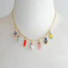 This statement charm necklace adds a bright pop of color to any outfit! It features 7 assorted charms with a mix of pearl, glass, and natural stone beads. The gold plated over brass chain is 16" inches long with a 2" extender chain. Beads may vary slightly from photos.