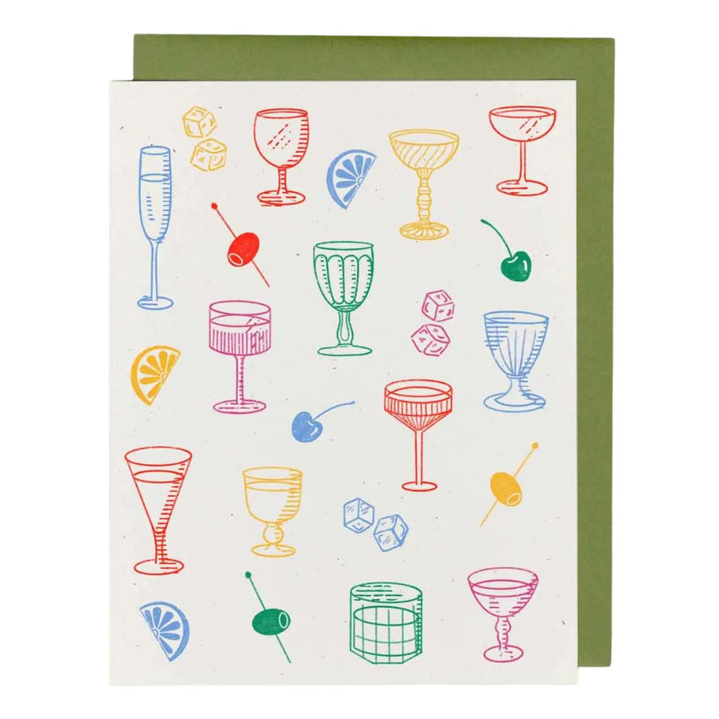 Raise a glass - all the glasses! This card features sweet illustrations of a variety of glassware and garnishes. Perfect as a thank you or a "just because" card.