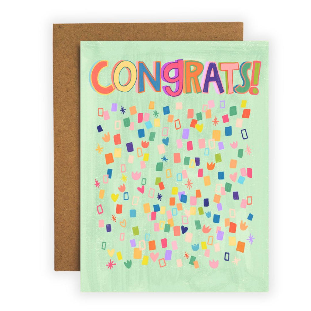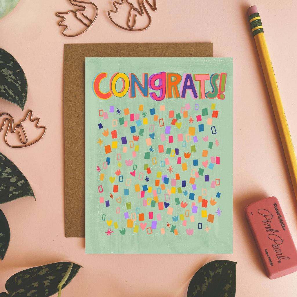 Say Congrats with illustrated confetti and no actual confetti mess! All cards are printed by Dream Folk in a home studio in South Dakota.