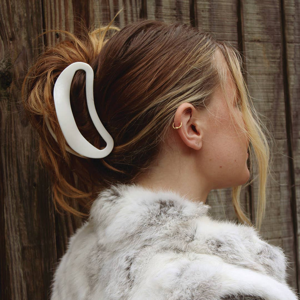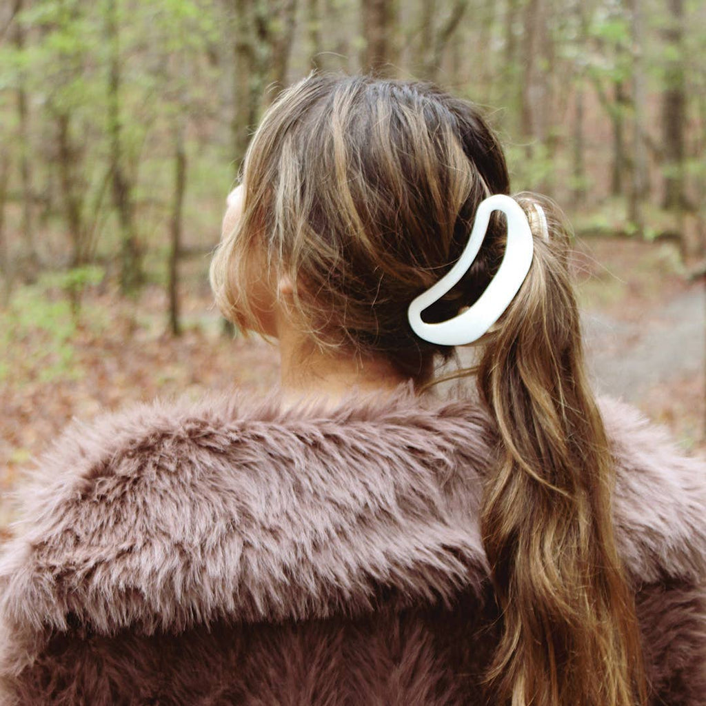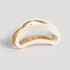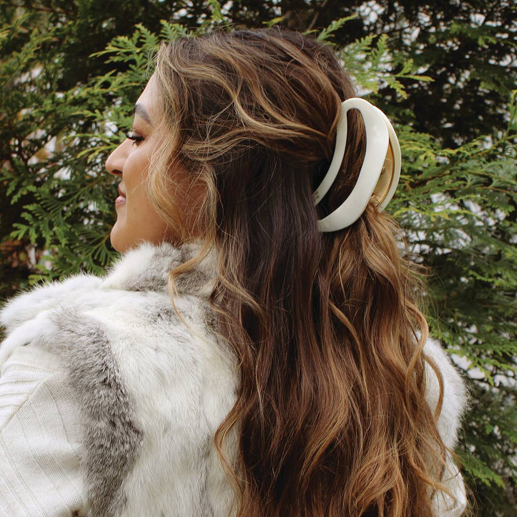 Calling all thick-haired girlies! This extra-large, abstract, open crescent shaped clip is the perfect accessory for taming your mane. Featuring a shiny cream color with gleaming gold accents, it's both cute and neutral. Wear it with any and every outfit!
