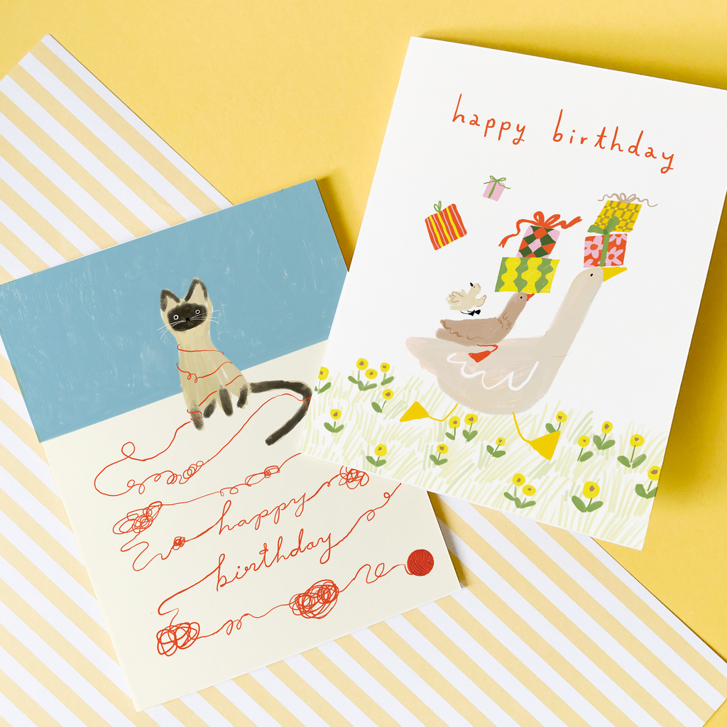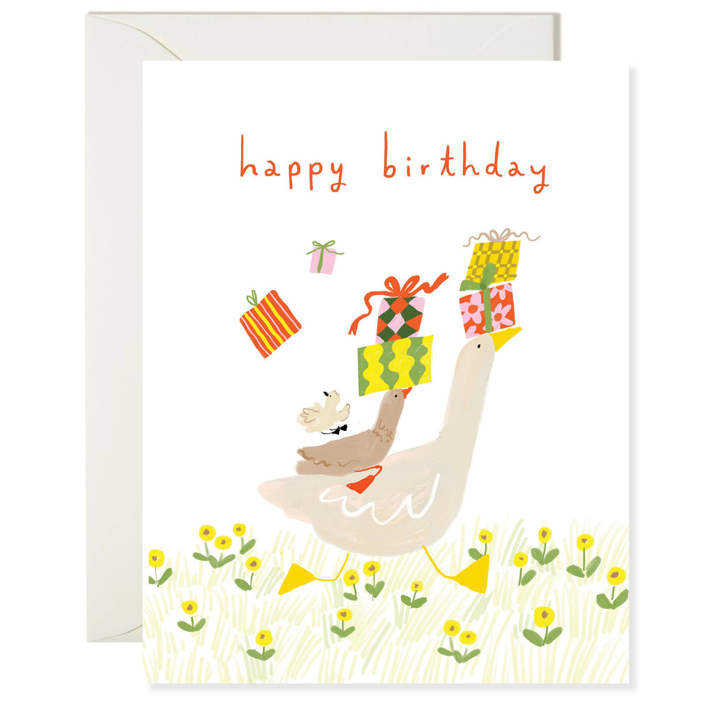 Deliver birthday joy in the most adorable way with the Duck Delivery Birthday card. This whimsical illustration features a group of charming geese waddling in a tidy line, each balancing stacks of wrapped gifts on their heads. “happy birthday” is nestled sweetly above the feathered procession, keeping the tone joyful and light. Perfect for animal lovers, cottagecore fans, and whimsical stationery seekers, this card is gentle and full of personality.