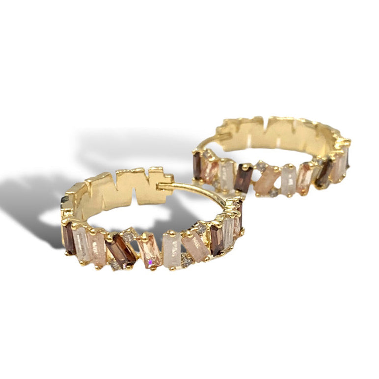 Make your ears sparkle with these hand-set, high-quality huggie hoops featuring oval cut pastel crystals. The gold finish adds a timeless touch to these sophisticated hoops.
