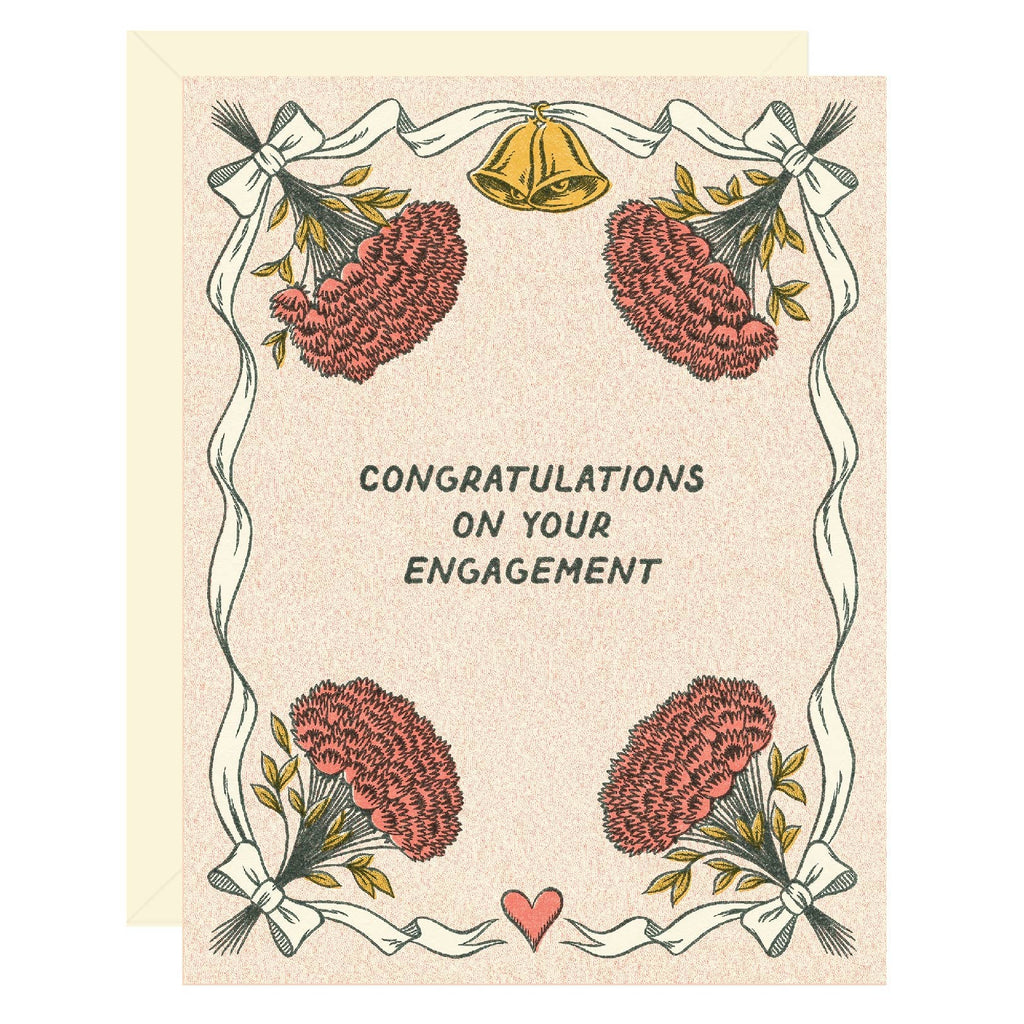 Vintage-inspired engagement card featuring floral bouquets, wedding bells, and ribbon details with the message “Congratulations on Your Engagement.” A timeless way to celebrate love.
