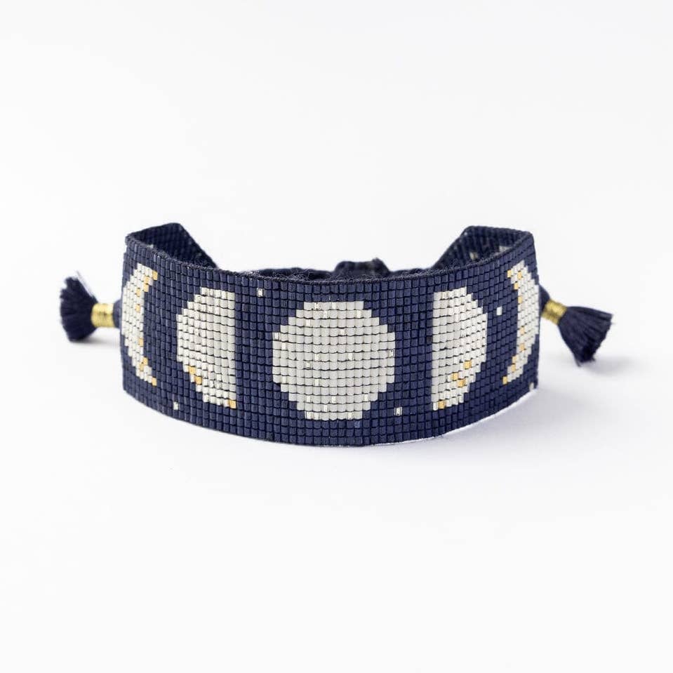 Channel your cosmic energy with the Erin Moon Phases Bracelet. Featuring a navy blue backdrop and silver phases of the moon design, this bracelet is perfect for the yogi, the stargazer, or your witchy bestie.