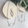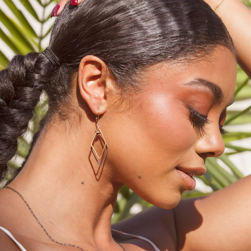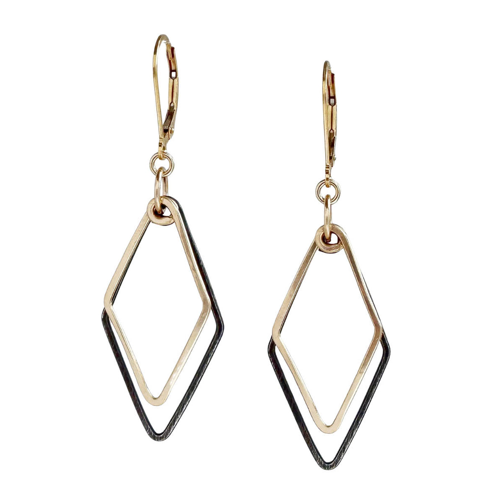 Elongated diamond shapes in mixed metals are stacked together for a sophisticated yet playful pair of earrings.