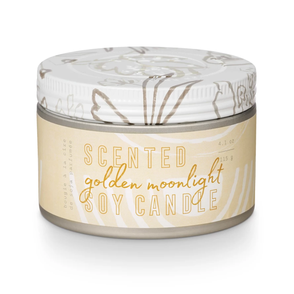 Golden Moonlight is a fresh and familiar scent for every room in the house. Great for gifting, the small tin with colored wax and a decorative wrap label makes a perfect addition to seasonal home decor. This scent features notes of sweet orange, sandalwood, and amber.