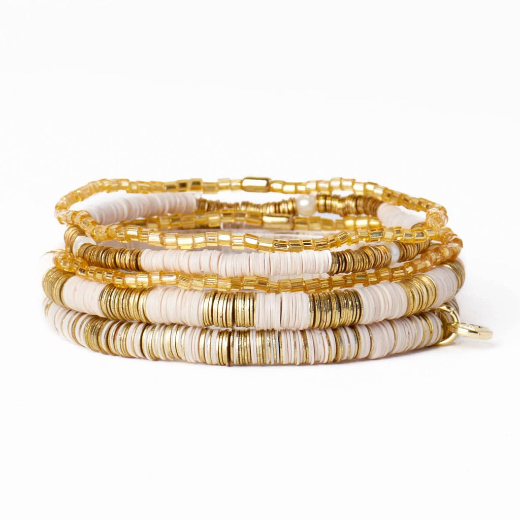 Elevate your look with the playful yet sophisticated charm of our Sequin Bracelet Stack Sets. This pre-curated combo, carefully designed with your style in mind, features five coordinating stretch bracelets in a timeless white and gold theme. Whether you're dressing up for a night on the town or adding a touch of sparkle to your everyday ensemble, these bracelets are the perfect accompaniment.