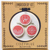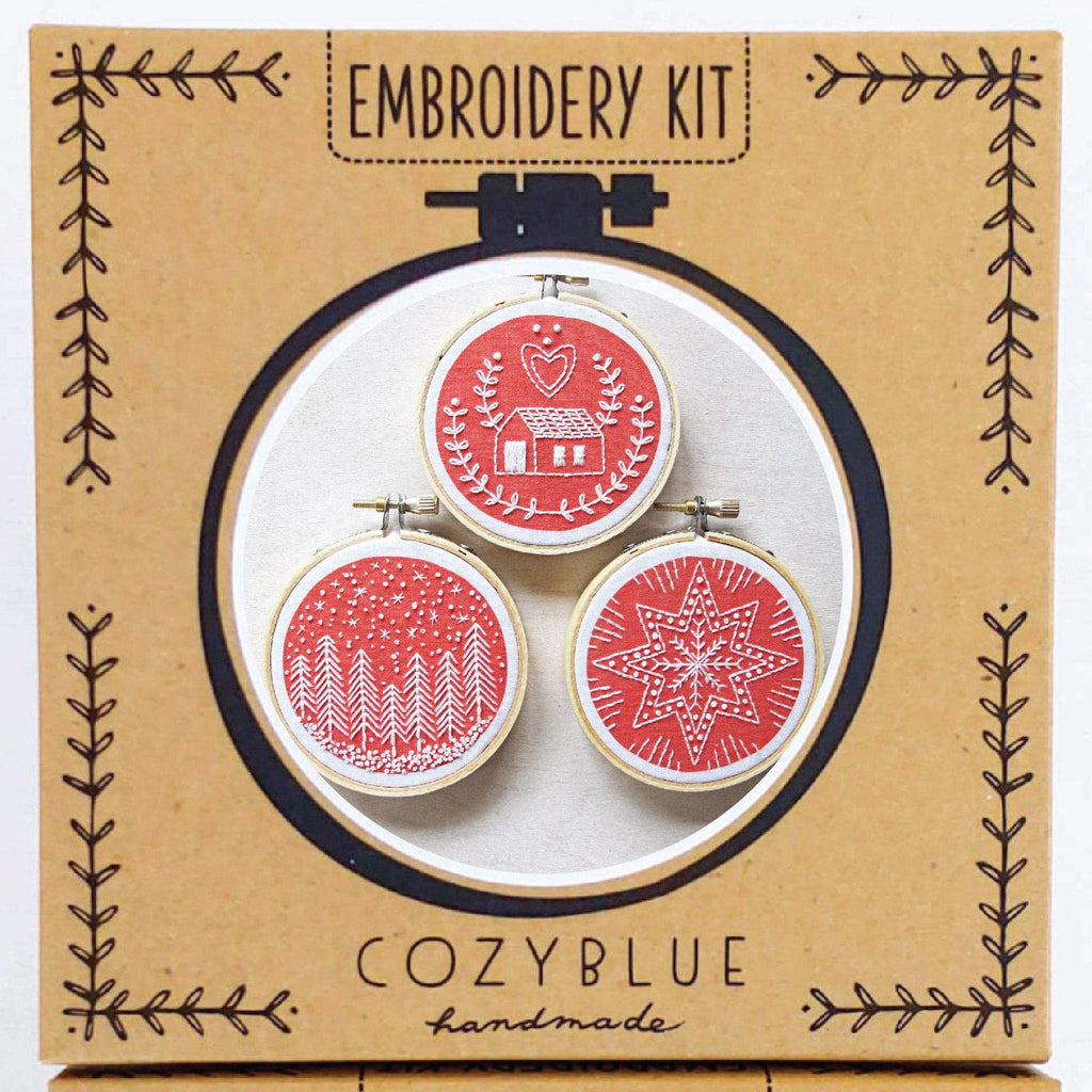 The kit has everything you need, including floss, needle, hoops, and detailed instructions to guide you through the process. Note: it's best to stitch all three designs before cutting them apart and framing in the hoops.