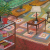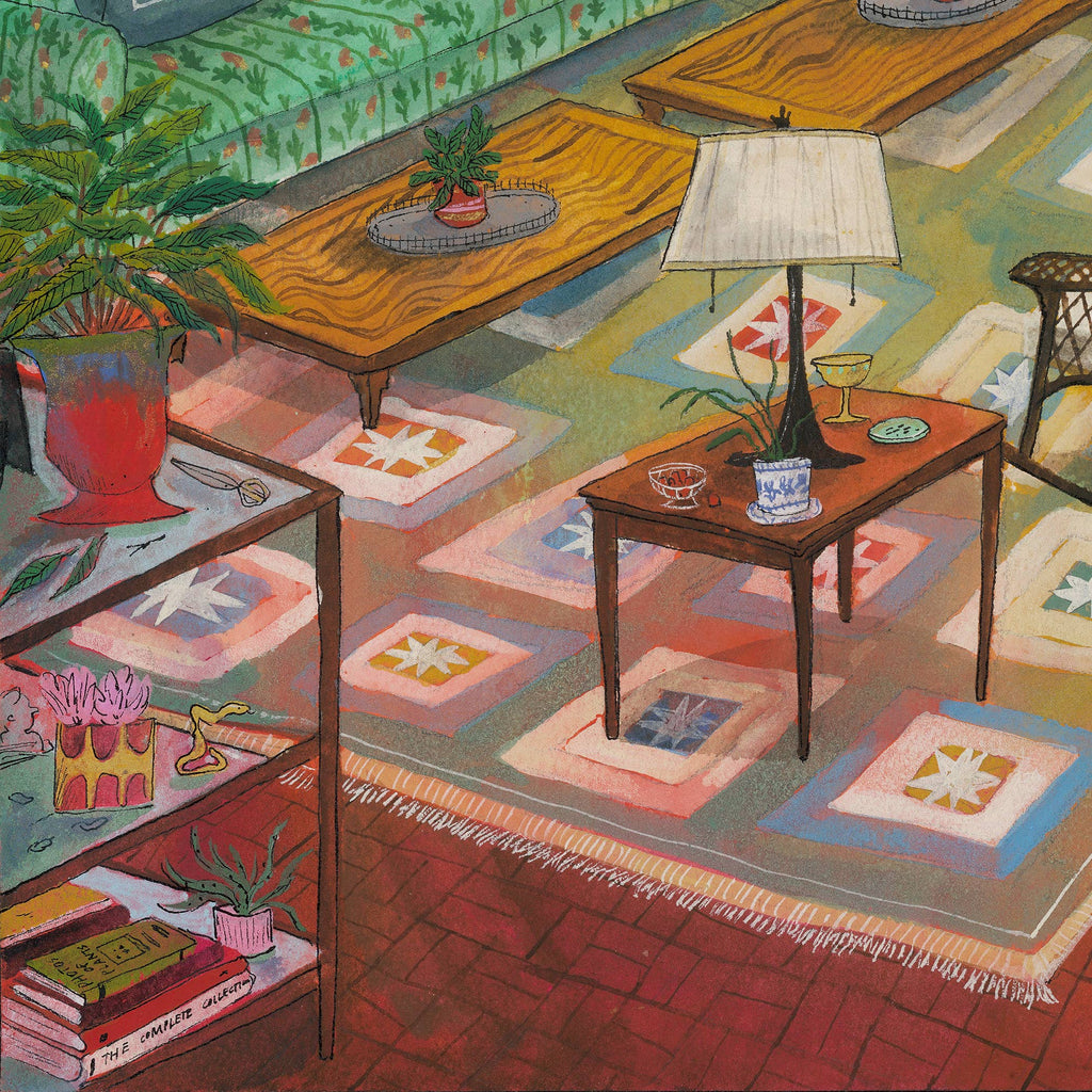 A sun-soaked room filled with plants and tchotchkes where one wouldn’t mind blending in. Her jumpsuit fabric matches her couch, but other details include: matching wicker chairs, a quilt-inspired floor rug and pillows, blue and white glazed pottery, a statuesque lamp, a little glass bowl of candy on the side table and a daisy coffee mug.