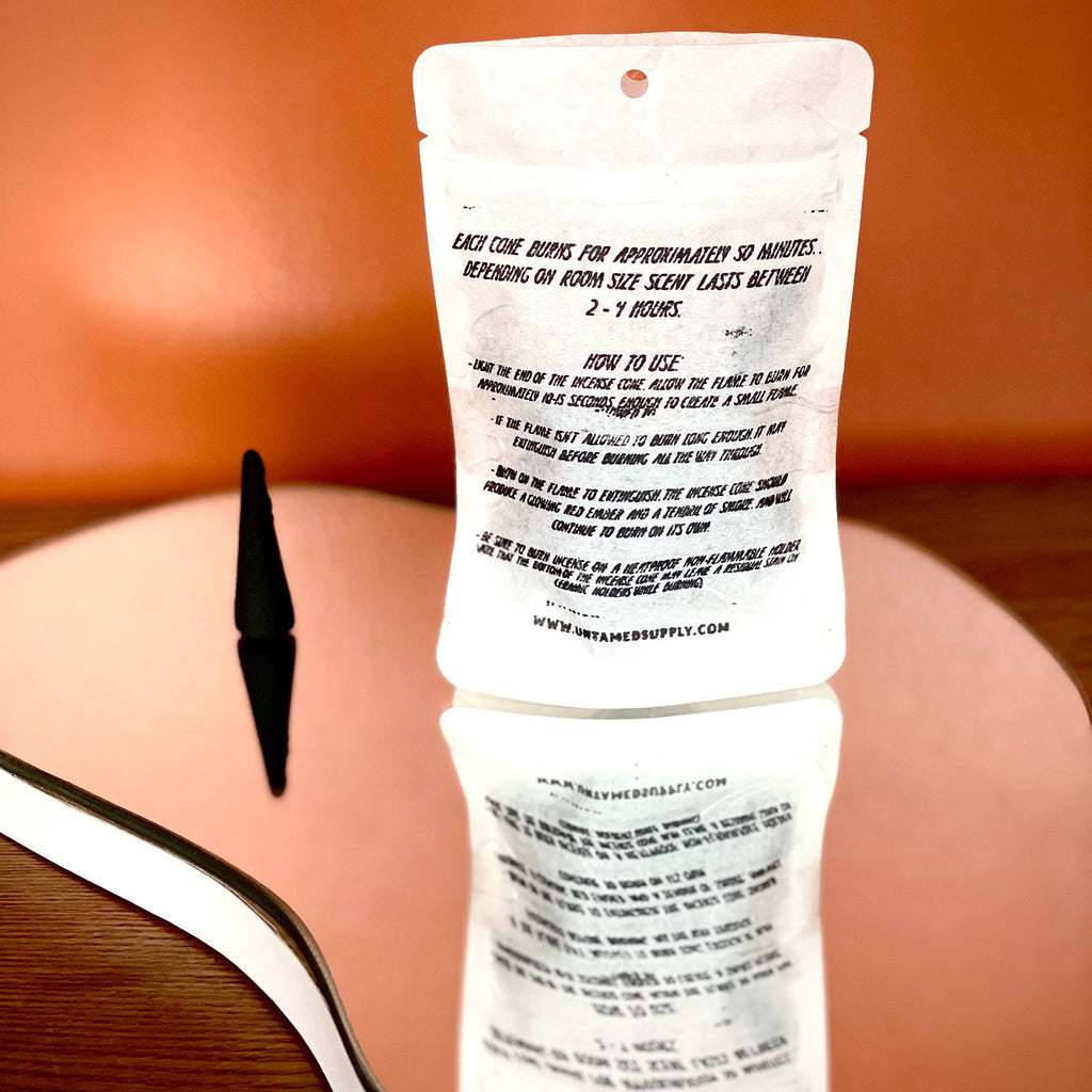 These charcoal incense cones are hand-dipped in Kansas City, Missouri and burn for approximately 50 minutes each. Made with paraben and phthalate-free fine fragrance oils for a clean, non-toxic burn.