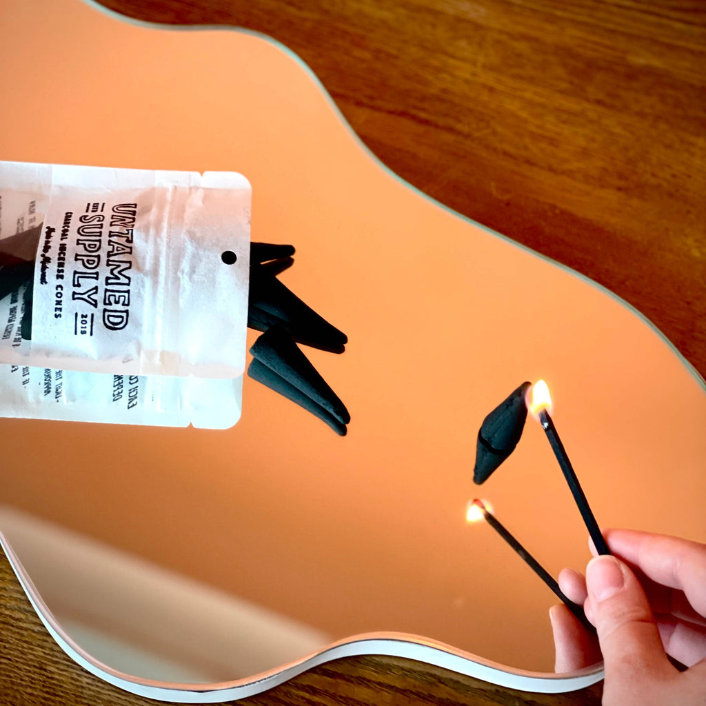 These charcoal incense cones are hand-dipped in Kansas City, Missouri and burn for approximately 50 minutes each. Made with paraben and phthalate-free fine fragrance oils for a clean, non-toxic burn.