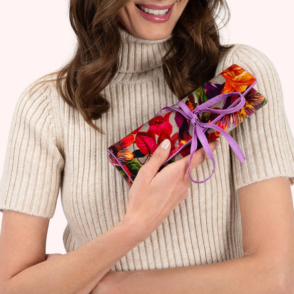 Keep your favorite jewels and heirlooms safely stored in this beautiful jewelry roll! With pockets and loops to protect rings, earrings, bracelets, and necklaces, it's the ideal travel companion. The Opulent Florals design features bold petals and glamorous colors - perfect for radiating a luxe vibe.