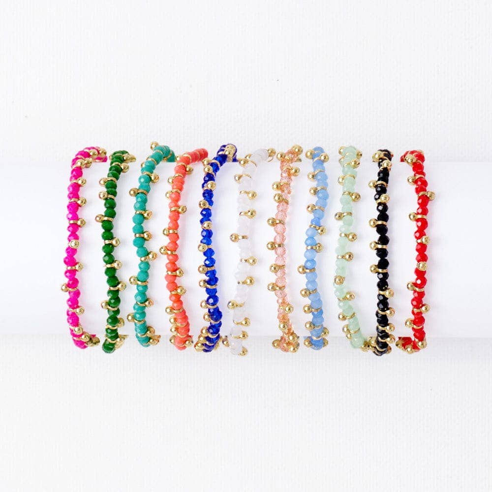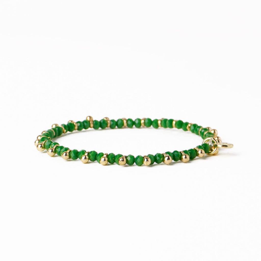Elevate your look with the simple yet sophisticated charm of the Kami Crystal Stretch Bracelet. Carefully designed with your style in mind, this bracelet features bright and clear kelly green crystals accompanied by shiny brass beads. Whether you're dressing up for a night on the town or adding a touch of sparkle to your everyday ensemble, these bracelets are the perfect accompaniment.