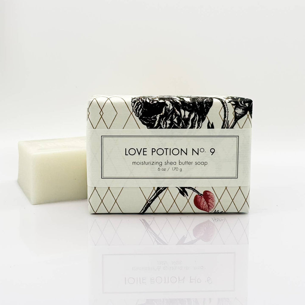 Limited edition! Gold Leaf Shea Butter Soap in Love Potion No. 9: a smoky, sexy blend but yet still very feminine & sweet. We've mixed Italian Bergamot, with Smoke, Amber, Peru Balsam, Jasmine, Musk, Sweet Honey, Pale Rose….and a touch of Champagne.