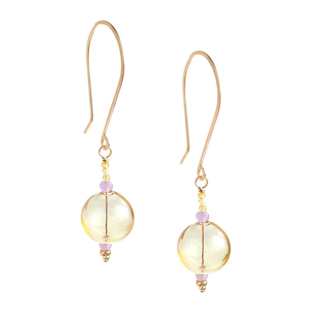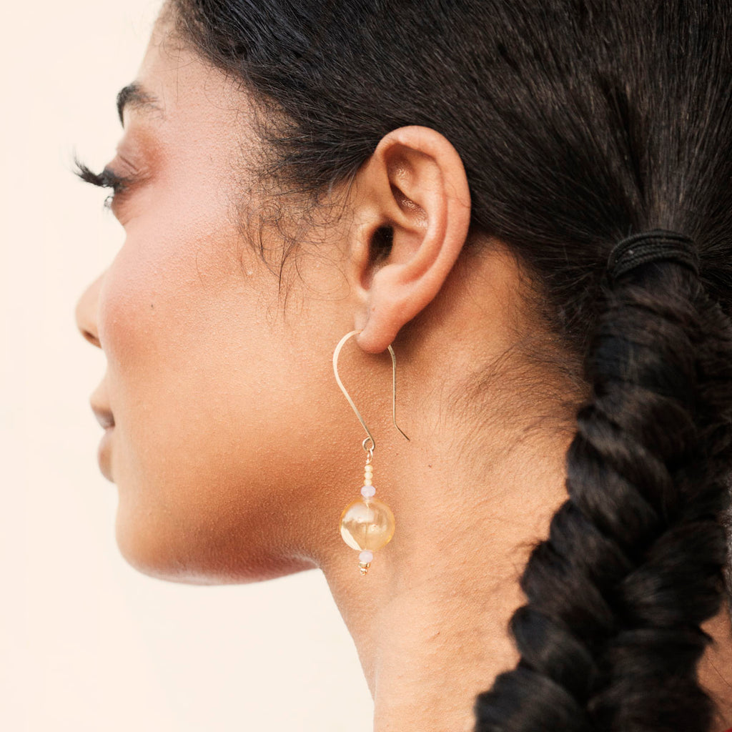 These eye-catching statement earrings feature vibrant bubble glass beads that create beautiful movement and color with every turn. Handcrafted in our Nashville studio, each pair combines bold artistic impact with surprisingly lightweight comfort for all-day wear.
