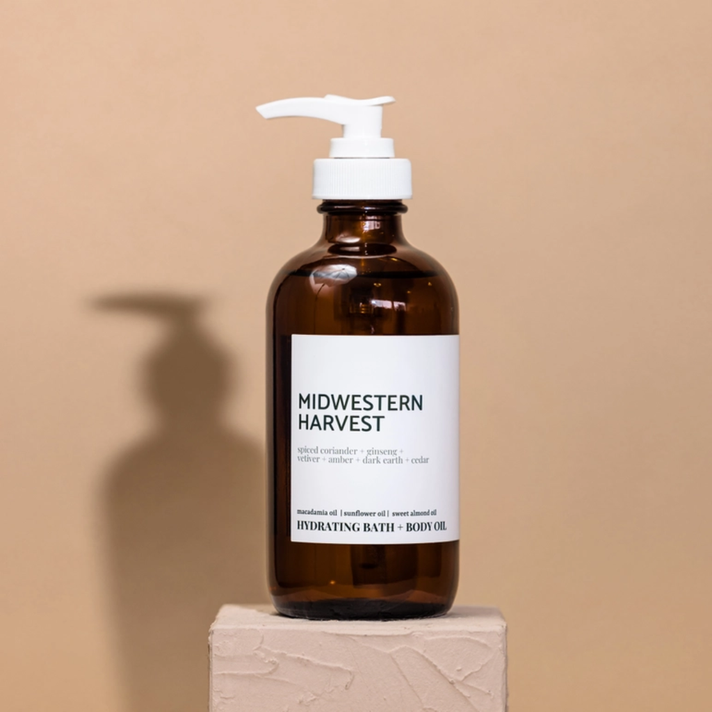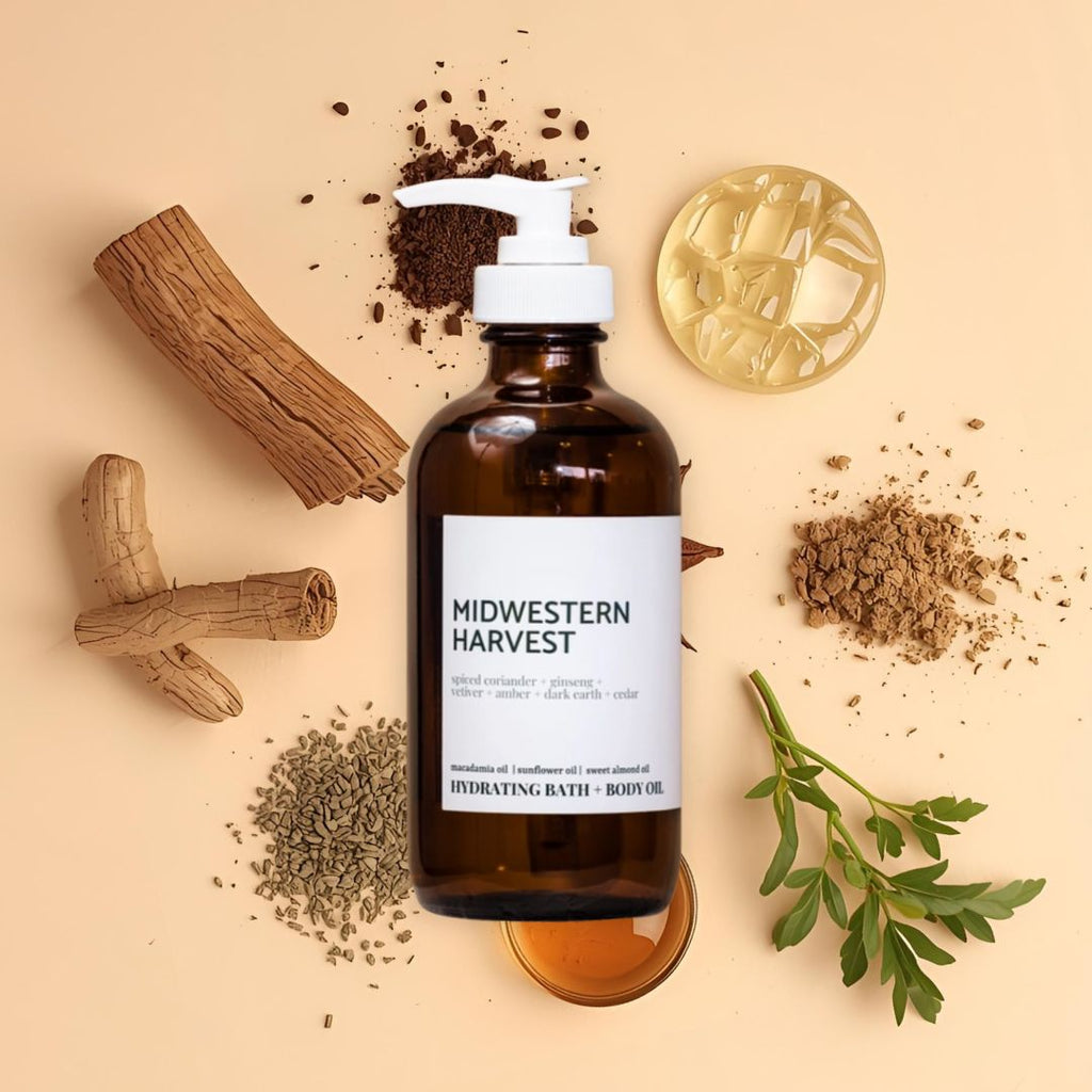 Midwestern Harvest has scented notes of: spiced coriander + ginseng + vetiver + amber + dark earth + cedar. Moisturizing and calming, this body oil will transport you to a beautiful fall day.