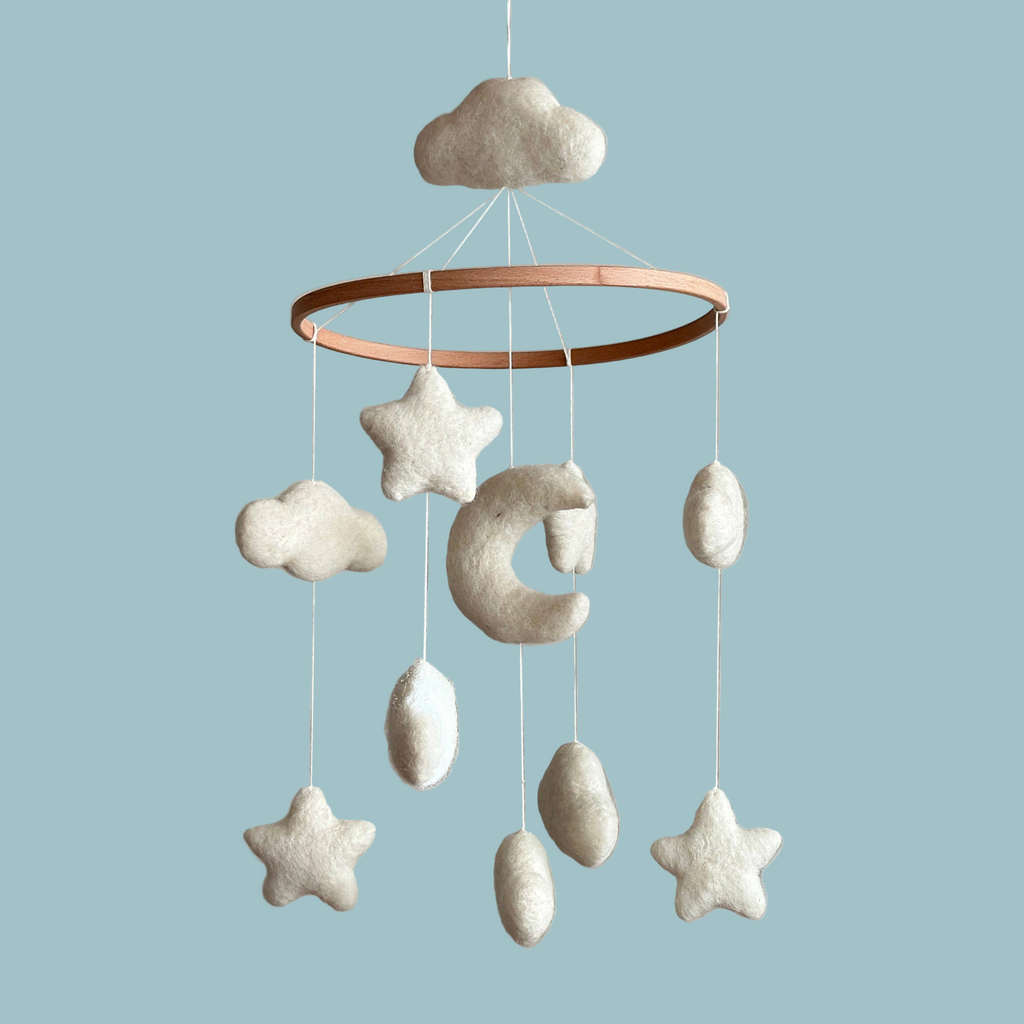 Bring peaceful charm to your nursery with this dreamy Cream Moon & Stars Mobile. Handcrafted from soft wool felt, this neutral-toned mobile features gentle clouds, soft stars, and a crescent moon, all suspended from a natural wood hoop. Perfect over a crib, changing table, or reading nook.