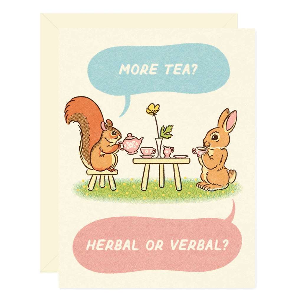 This quippy card invites a friend to your next gossip sesh, or launches the silliest of pen-pal catch-ups as two forest creatures gather to spill the tea- both herbal and verbal!