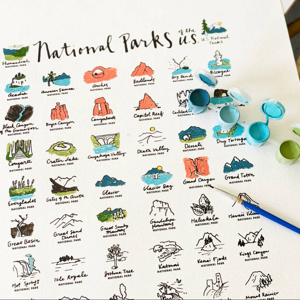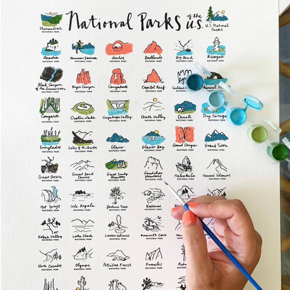 Paint your own National Parks poster with these paint-by-number map prints and matching paints! This kit makes for a fun and relaxing activity, and your finished poster is suitable for hanging and enjoying for years to come. In this design, the spaces are not numbered; instead, use the provided color map guide to paint your images.