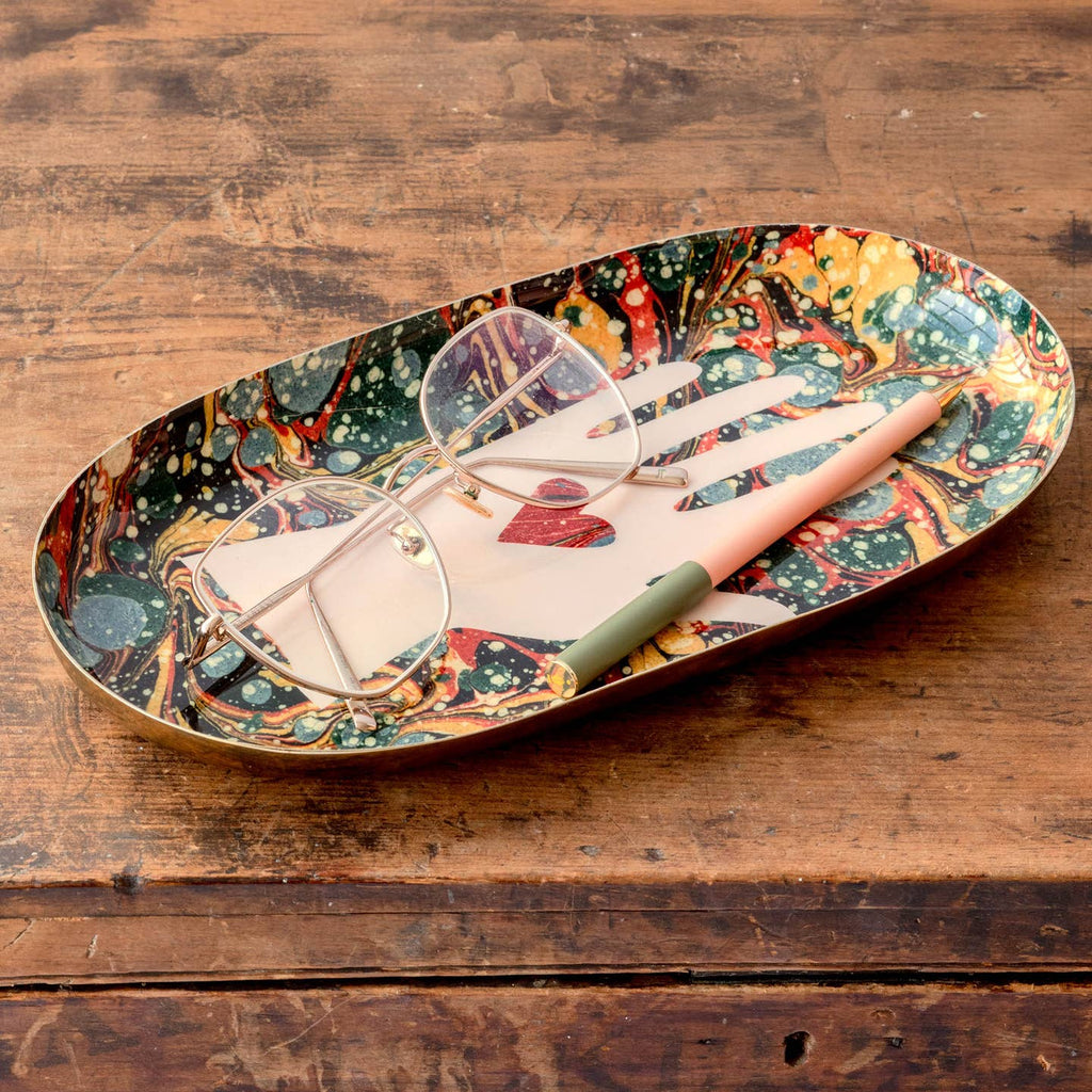 Add a touch of vintage charm to your home with the Heart in Hand Oval Enamel Tray. Expertly handcrafted in India, each tray is unique, with variations in the final product due to the handmade process. This decorative tray features the classic heart-in-hand design, inspired by the Victorian symbol of love, paired with a rich red vintage marbled background sourced from antique book endpapers found in a New York City bookshop. Perfect for holding stationery, jewellery, or other trinkets, this tray is both functional and charming—an ideal home accessory that brings a sense of history and love into any room.