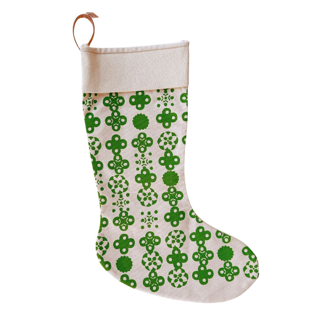 Hand printed holiday stocking with leather loop for hanging. Nubby cotton folded top finish detail. A sweet fun print everyone will enjoy! Perfect for adding a pop of color to your Holliday decor! Hand-drawn pattern and silk screen printed with water-based solvent-free inks with hem finish.