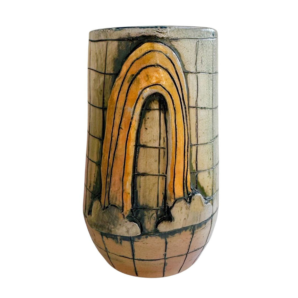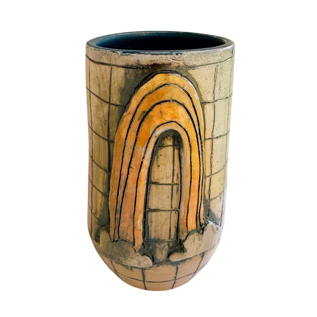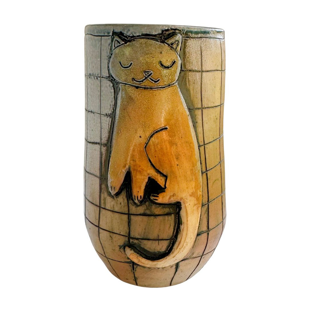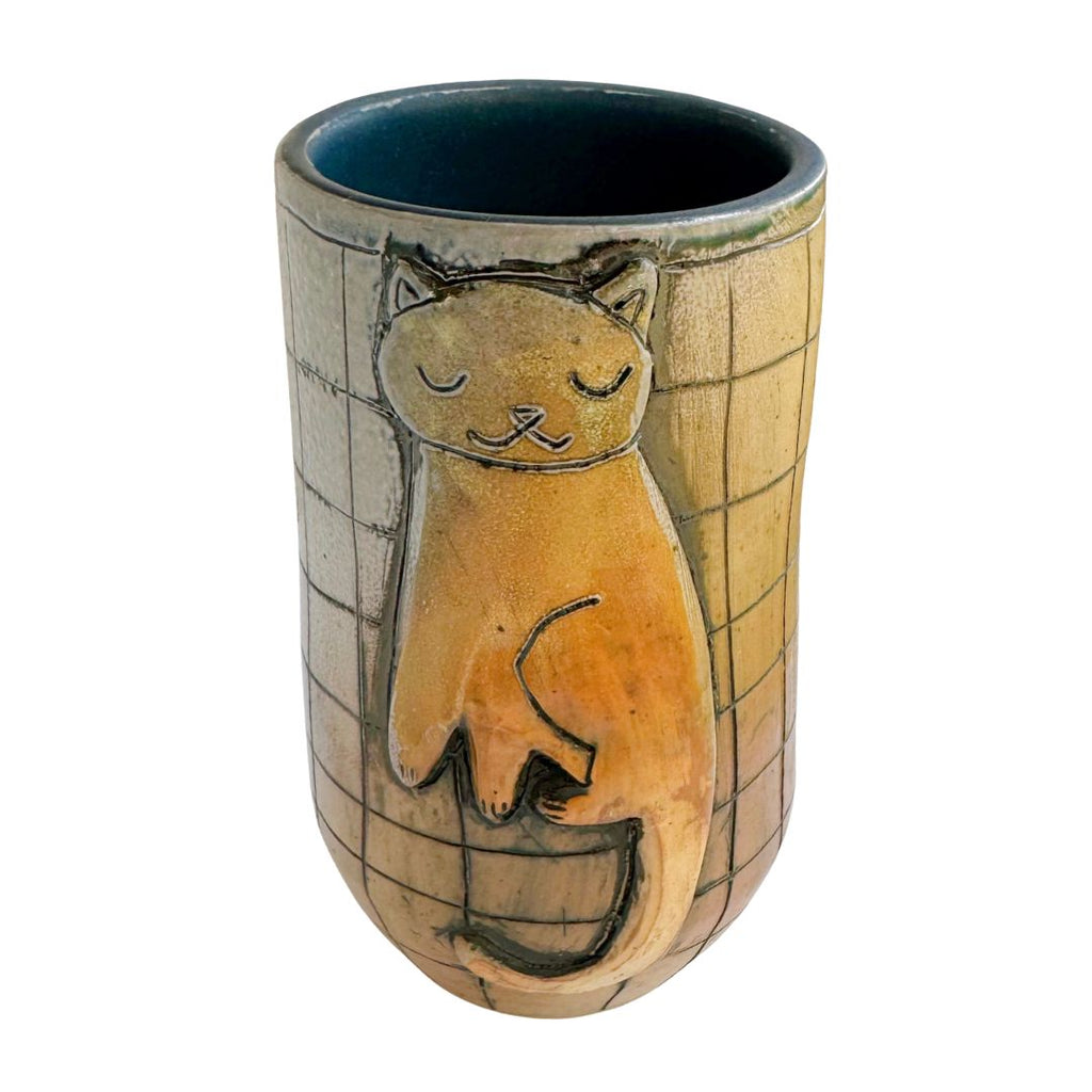 We can't get enough of these quirky handmade pieces by Molly Makes Critters. Each cup is one-of-a-kind and truly a work of art. As you turn the cup, you'll see a cat and a monochromatic rainbow. The inside is a deeply hued blue.
