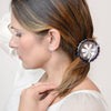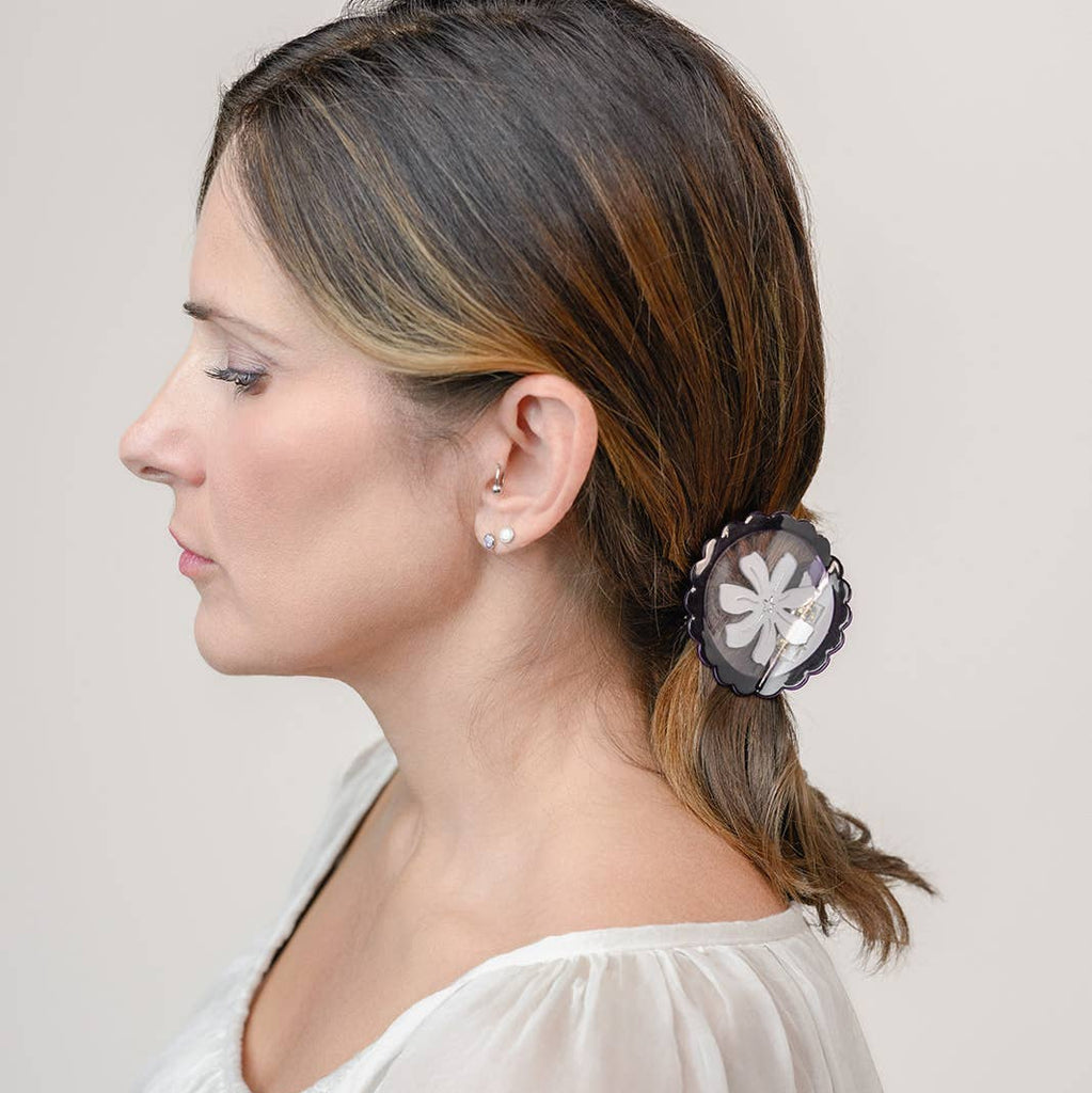 This design places the focal point on the asphodel bloom, surrounding it with clear acetate, framed by a two-toned black and deep purple scalloped border, and painted with intricate silver details. A smaller circular version of the Asphodel Claw.
