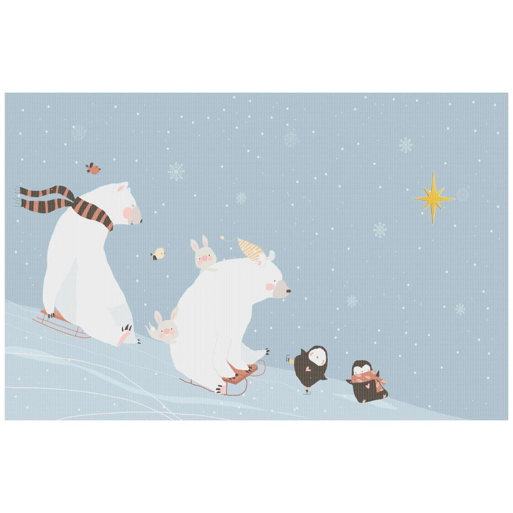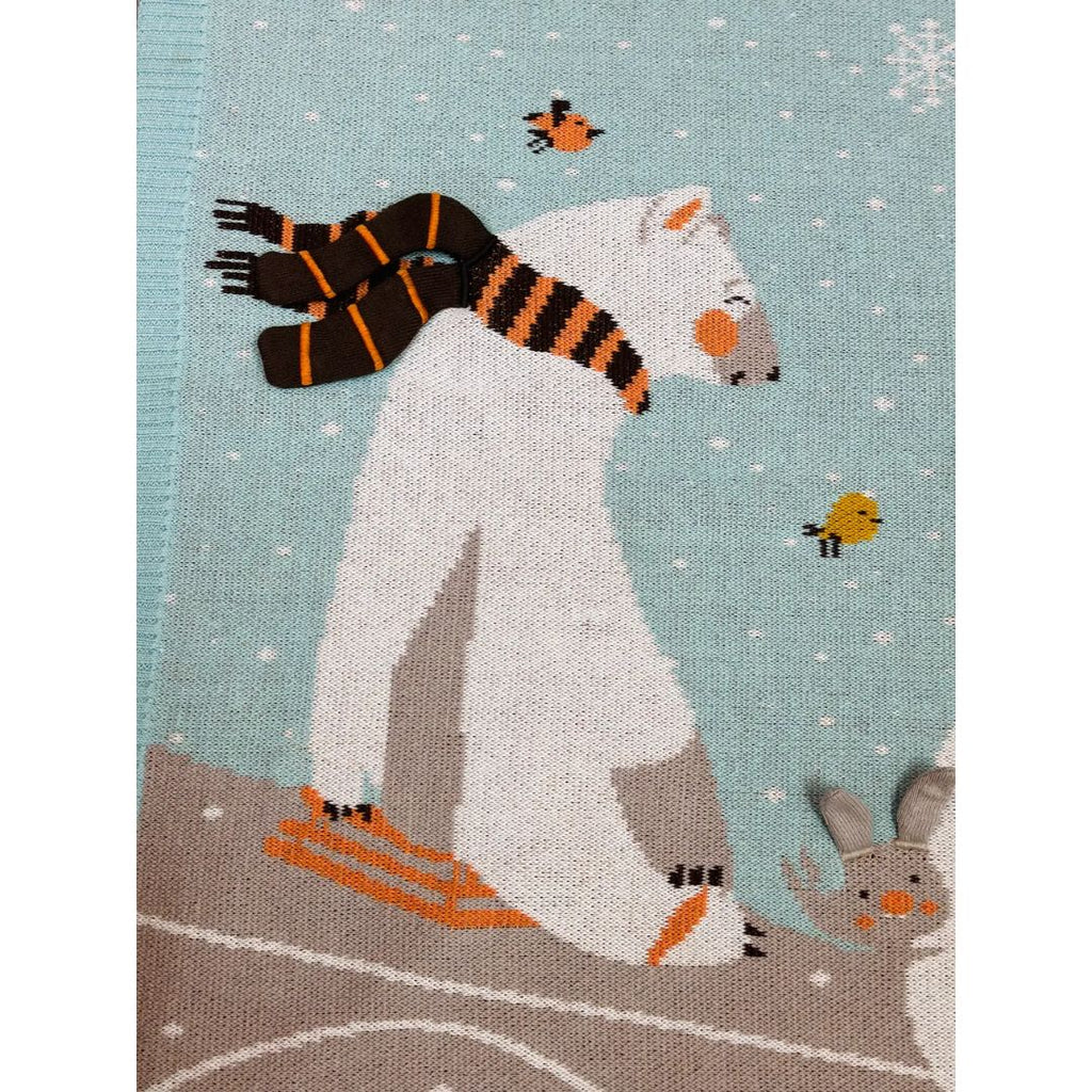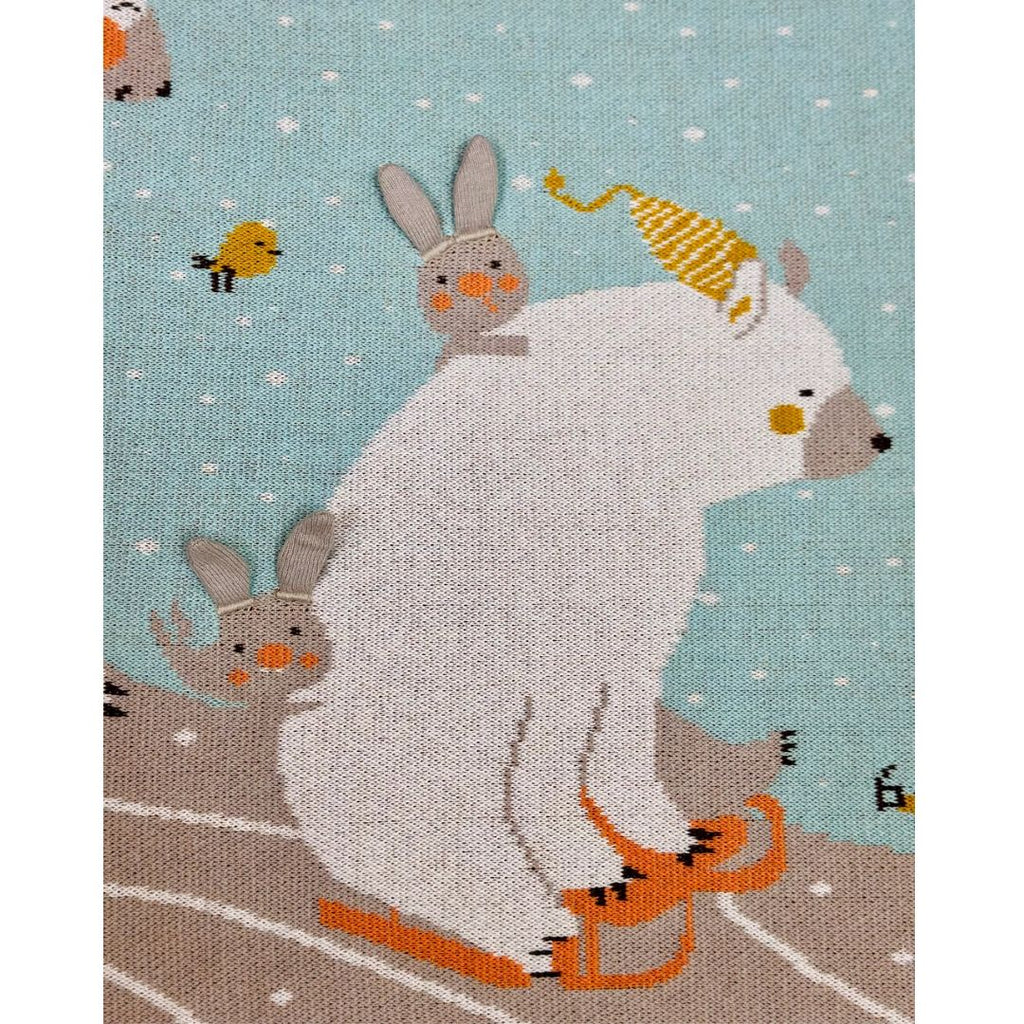 Wrap your little one in warmth and wonder with this luxurious 100% organic cotton jacquard knitted baby blanket! The enchanting design features joyful polar bears sledding down snowy hills alongside playful bunnies, bringing winter magic to every cuddle. The polar bear wears a charming 3D knitted scarf, while adorable bunnies have delicate 3D ears for a tactile experience. Above them, a gold-embroidered North Star shines brightly, guiding their snowy adventure.