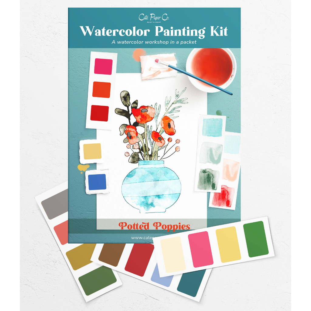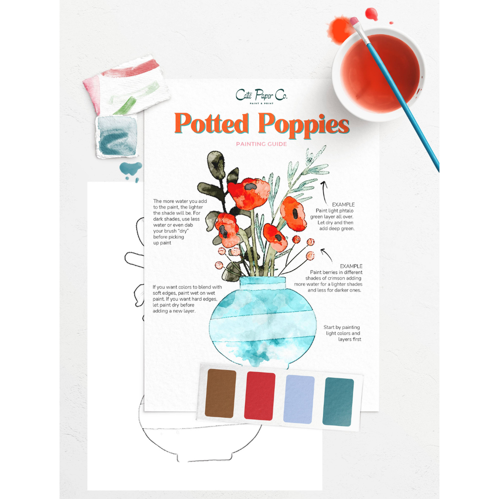 Paint your own watercolor potted poppies with this DIY kit! It includes a complete outline and paints, as well as a painting guide. This kit is compact and portable-- just add water and you can paint anywhere! No prior experience is necessary, and it's beginner friendly!