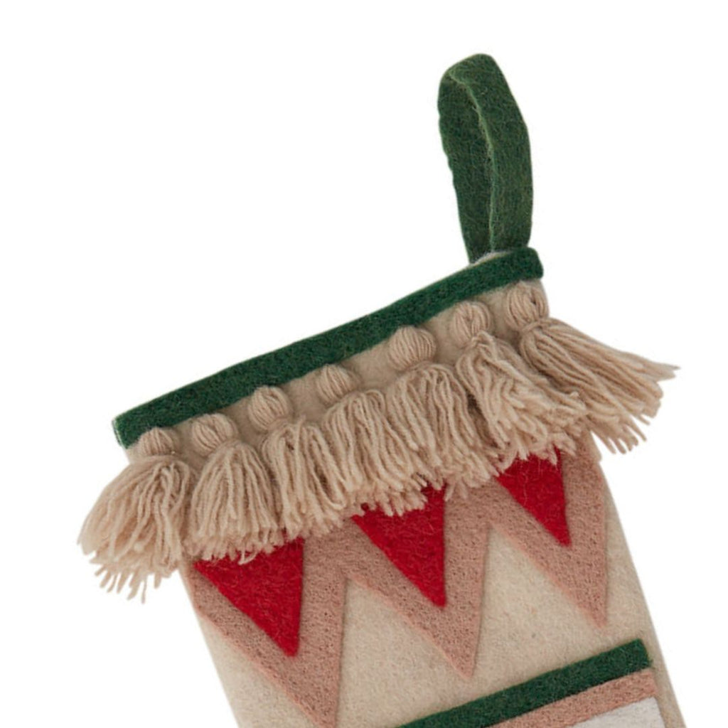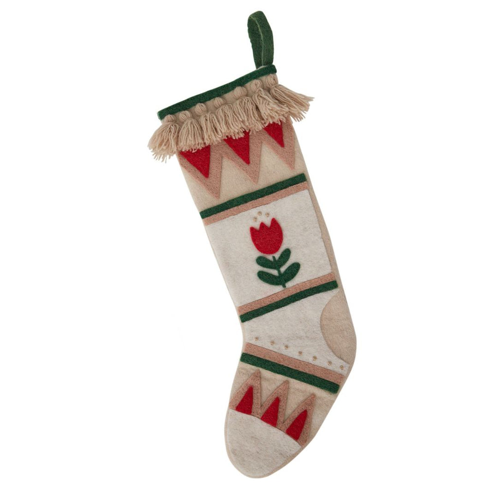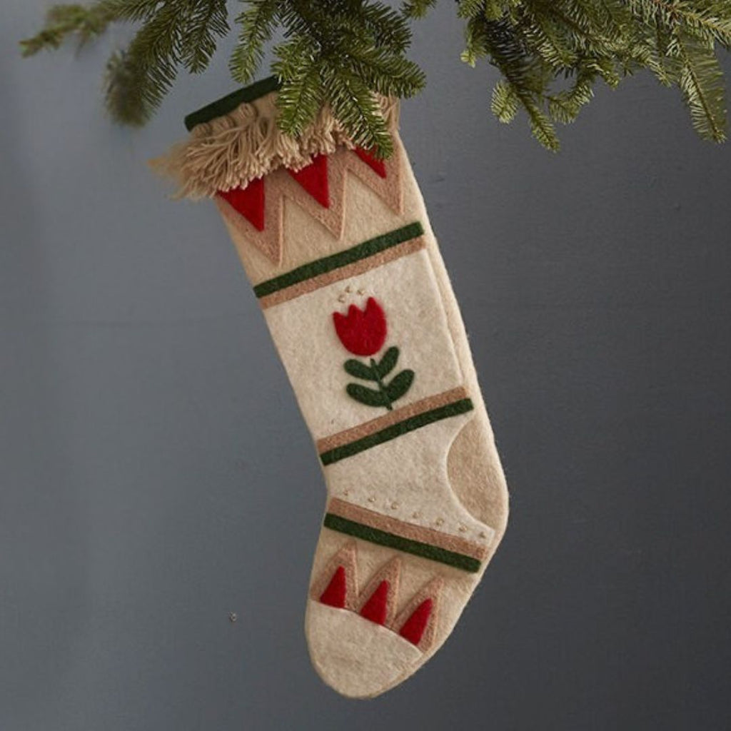 This Scandinavian-inspired Christmas stocking features beautiful wool felt construction with a charming red tulip design and geometric triangle patterns. The folk art style gives it that cozy Nordic feel that's perfect for the holidays.