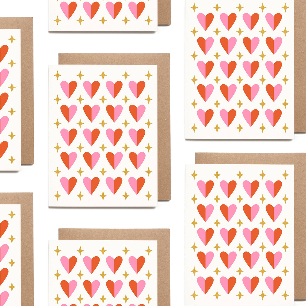 A multi-purpose Valentine card featuring gold metallic stars and a vibrant pink and red heart pattern! This greeting card works for significant others, lovers, friends, gals, pals, and anyone you want to spread love to.