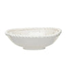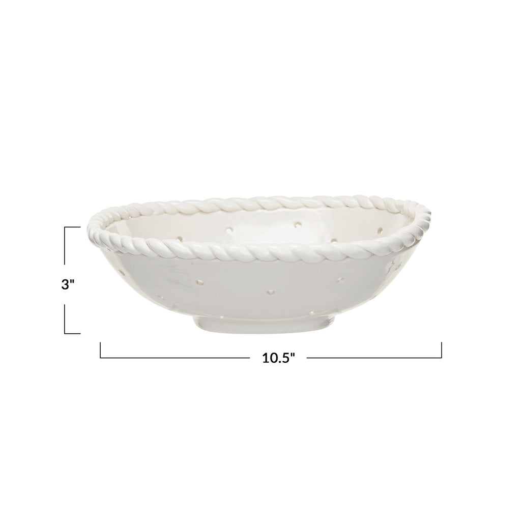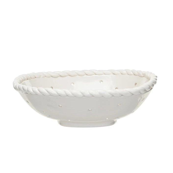 This stoneware berry bowl features a beautiful braided rope rim detail in classic white. The drainage holes make it perfect for rinsing and serving berries or other small fruits. The elegant design with the textured rim adds a decorative touch to your kitchen or table.
