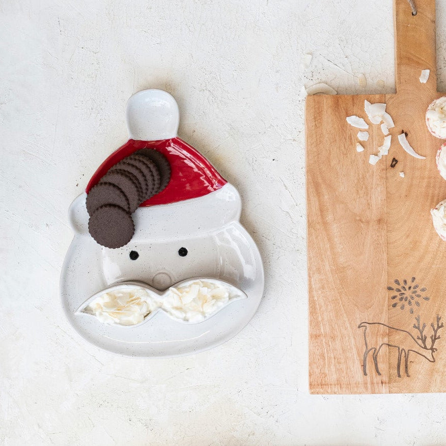 This Santa Head platter with a separate mustache dish is perfect for all your holiday parties! Add some whimsy to your dinner table and add some Christmas magic to any of your festive appetizers. With adorable details and a sturdy, speckled, stoneware finish, this Santa platter is perfect for the hustle and bustle of the season.