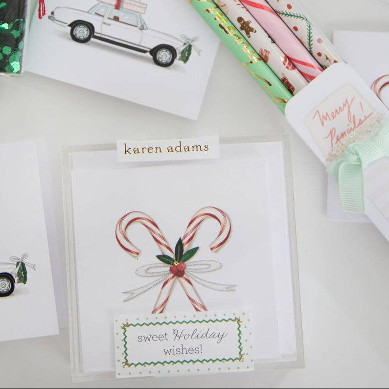 These cards are absolutely adorable! Share holiday wishes with this perfectly sweet box of hand-glittered candy cane cards. Book-folded and blank inside, they work great as small cards or gift enclosures.