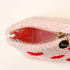 The interior is lined with a fun printed fabric, making it as stylish on the inside as it is on the outside. Cute, cozy, and full of love—these pouches are the perfect way to elevate your accessory game this season!