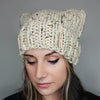 This handmade fitted knit beanie features a flat closure that creates adorable "cat ear" points! Made in Michigan with high quality, soft, chunky yarn and knit by hand with care. The soft, comfortable fit works for most head sizes at approximately 20-24 inches.