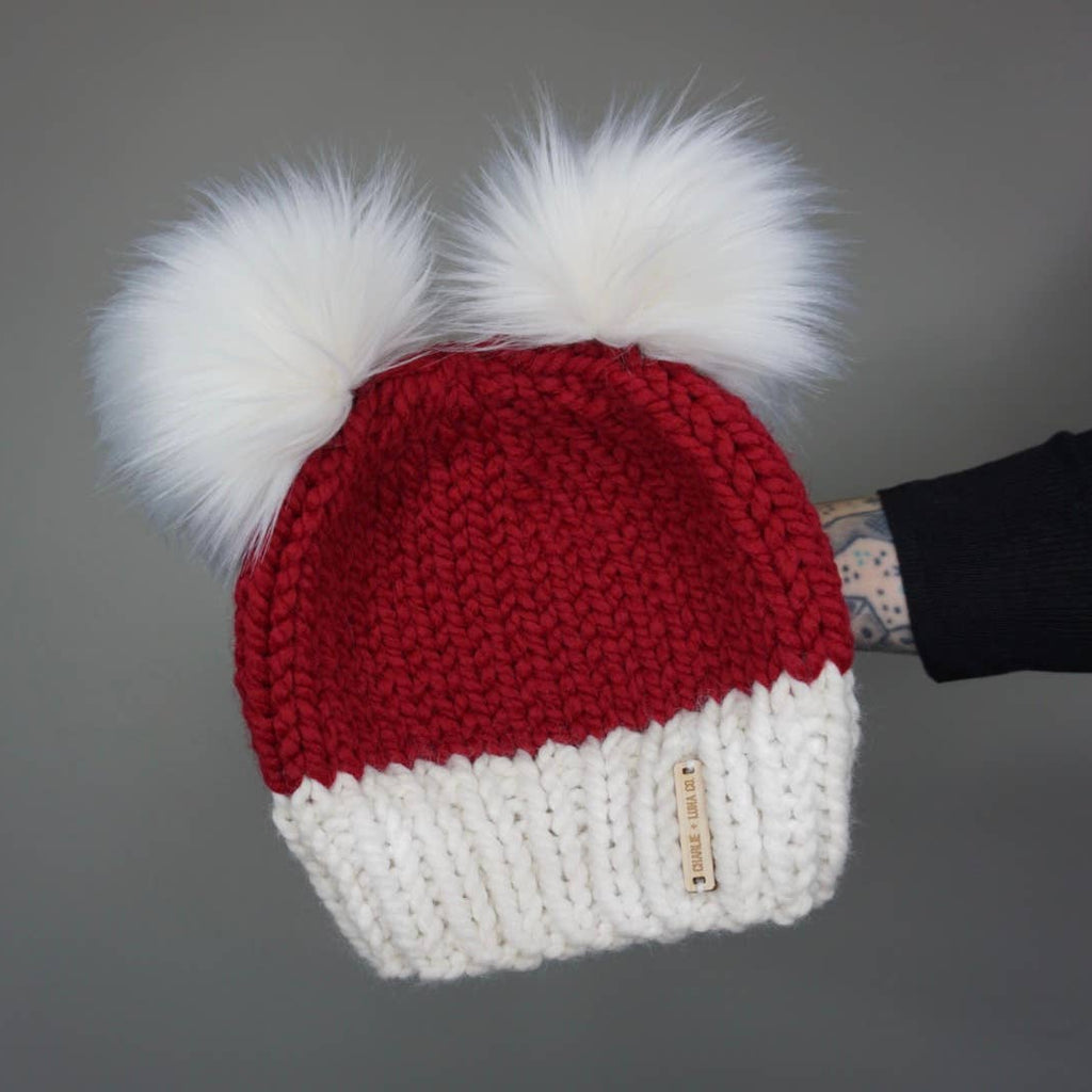 Get cozy with this festive and comfy Santa Double Pom Beanie from Charlie & Luna Co.! Knit by hand with care and thoughtful attention to detail, this beanie was made with high quality, soft, chunky wool and acrylic blend yarn. For the ultimate comfy and cozy winter accessory, designed to keep the warmth in, this hat stretchy yet fitted, and features two faux fur pom poms! This beanie makes the perfect gift for anyone this winter season, perfect for men, women, teens & anyone who loves a chunky hat.